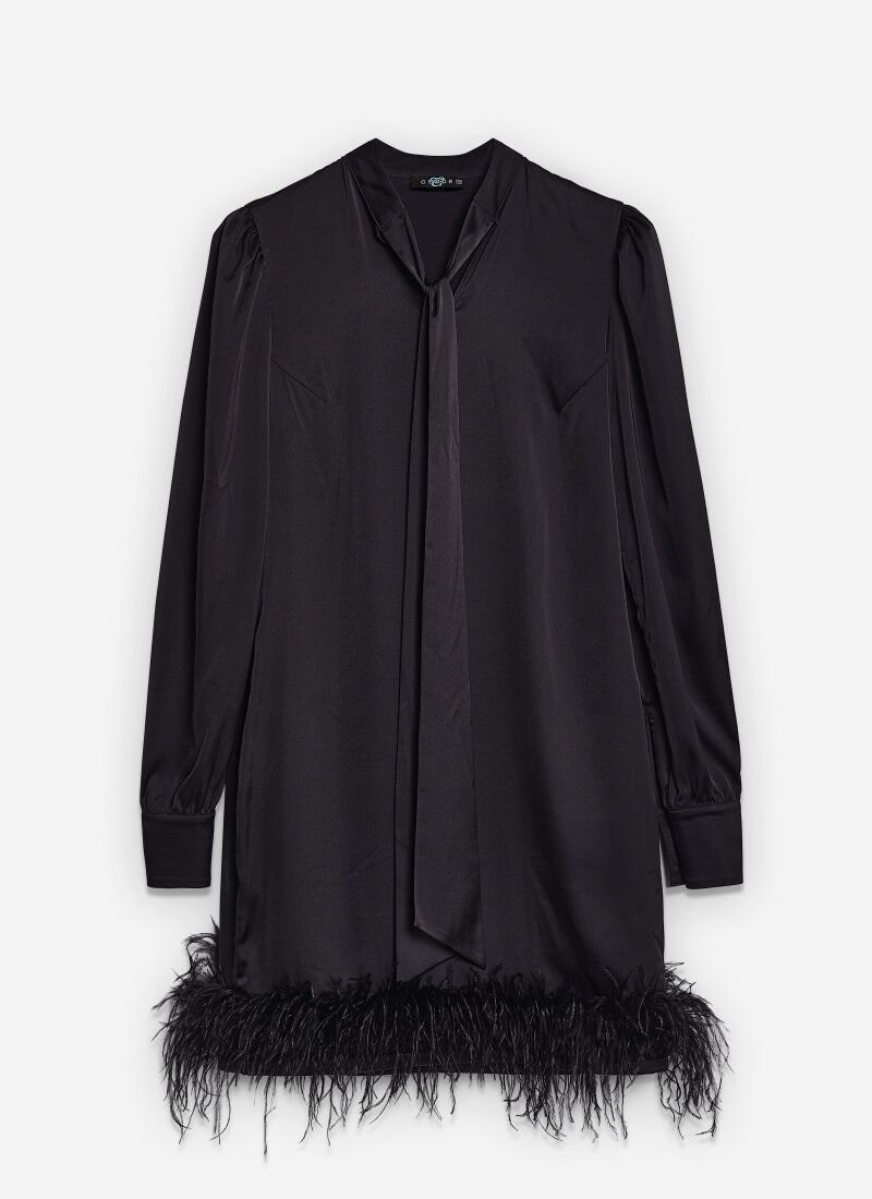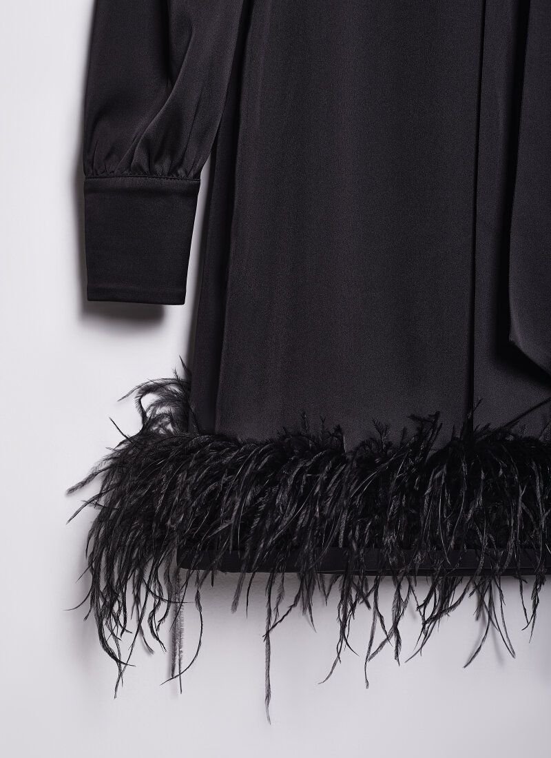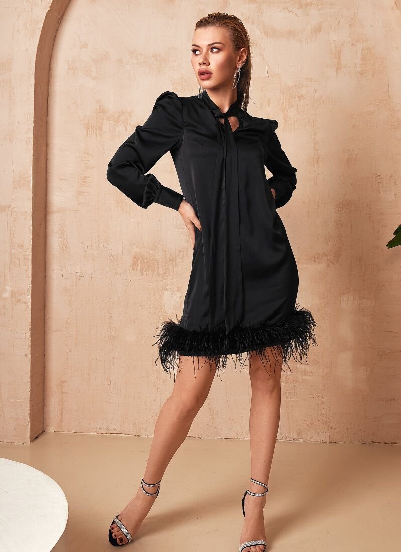 It's hard to go unnoticed in a cocktail dress from Gepur designers. The loose cut in combination with the hem, decorated with light feathers, looks especially impressive. For sewing a model with an ascot collar and long sleeves on the cuffs, black silk fabric was used, which gives it a soft shine._x000D_