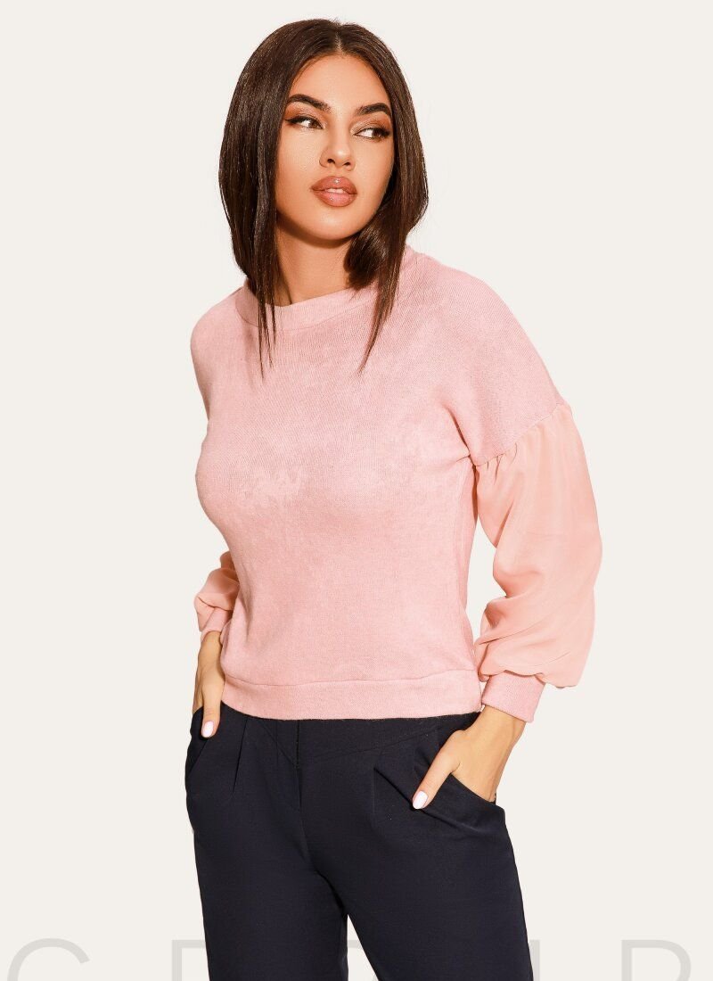 Cozy jumper in a powdery shade: loose fit, voluminous raglan sleeve, complemented by a solid chiffon insert, knitted upper and lower edges.