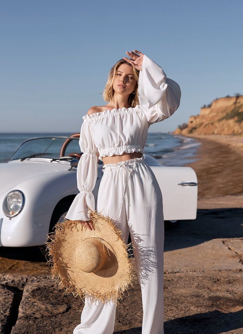 Romantic summer set from Gepur designers. To create this model, a soft fabric with a compressed texture was used. The trendy top of the cropped cut is distinguished by a deep boat neckline with elastic inserts, which allows you to open the shoulders. A spectacular long sleeve with a flounce and ruffle decor are some of the most relevant details of SS21. Flowing summer trousers of a loose cut, made of soft pressed fabric. The trendy high-rise trousers are marked by an elastic insert, ruffles and a removable belt in loops. Two small pockets on the sides give the model its practicality.