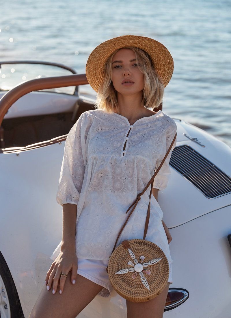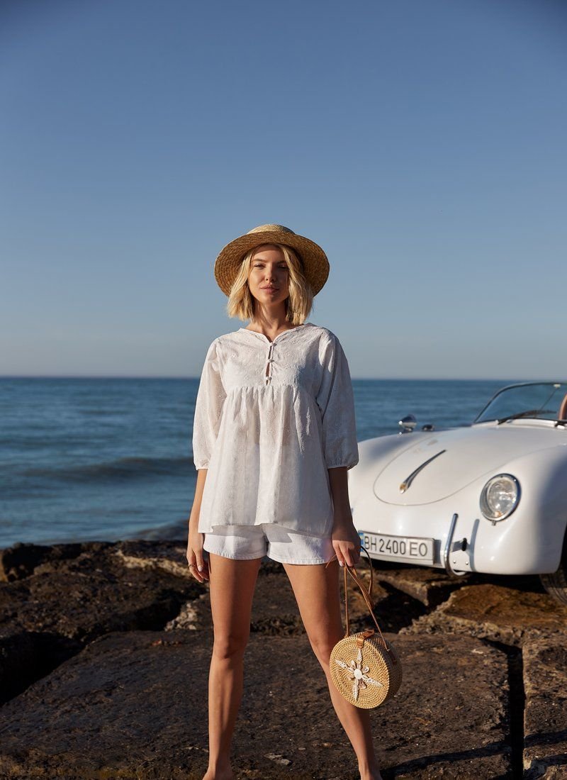 The white blouse seems to be created for feminine romantic images. To cope with this task helps the color, the cut with an inflated waist, and most importantly - the material. For sewing a blouse with 1/2-length sleeves, weightless cotton was used, which passes air and is decorated with openwork embroidery.