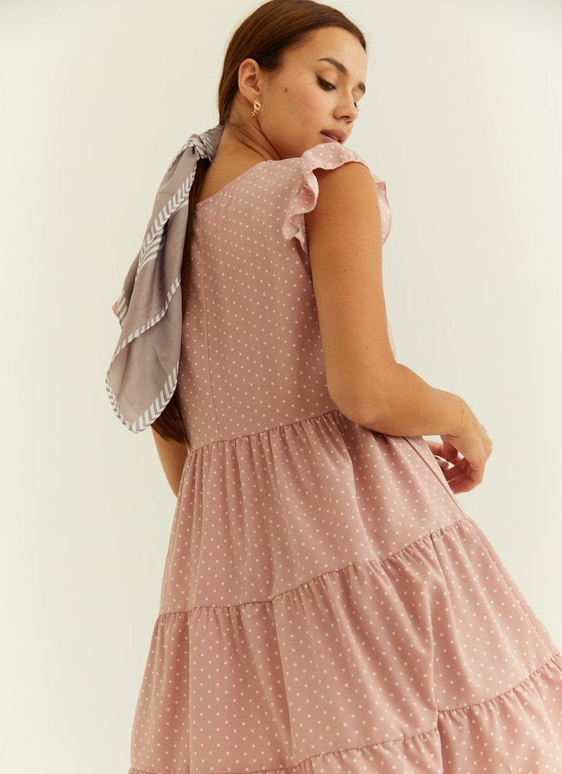 A short dress of a powdery shade, made of flowing fabric. A small v-neck on the chest, short wing sleeves and a tiered skirt, which gives the dress lightness. The model is decorated with a contrasting print in small polka dots.