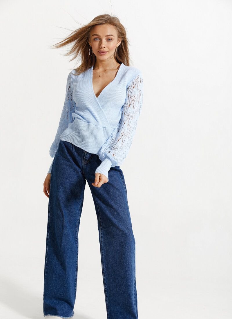 A cozy pullover of a delicate blue color. V-neck, long openwork sleeve on a wide elastic cuff. Fixed smell .