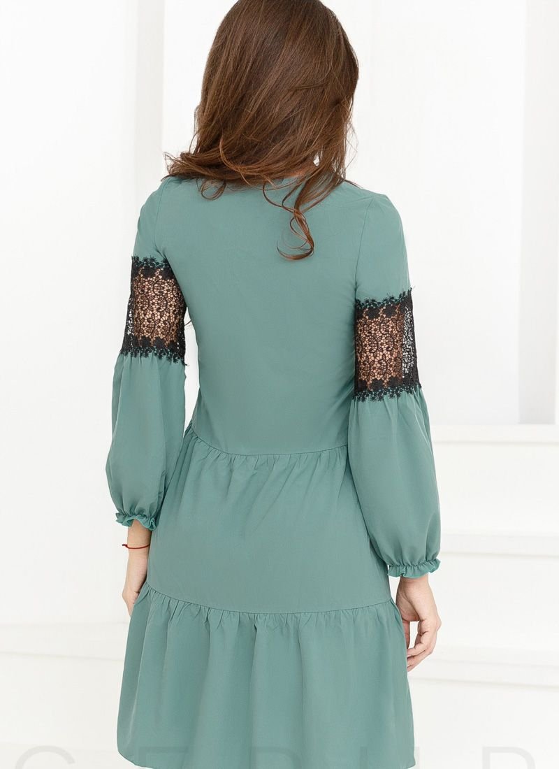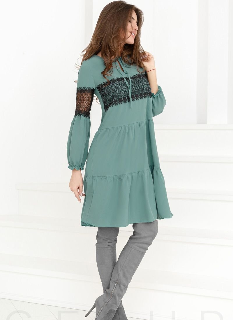A loose-fitting dress with a tiered skirt, a small v-neck with ties, elastic cuffs and contrasting lace inserts.