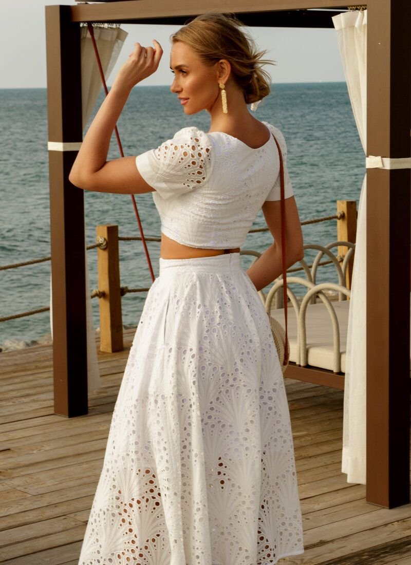 A short-sleeved top and a full skirt create the perfect combination for a feminine summer look. The skirt is complemented by a decorative button placket and a hidden zipper at the back. The top with a deep neckline, short sleeves is buttoned.
