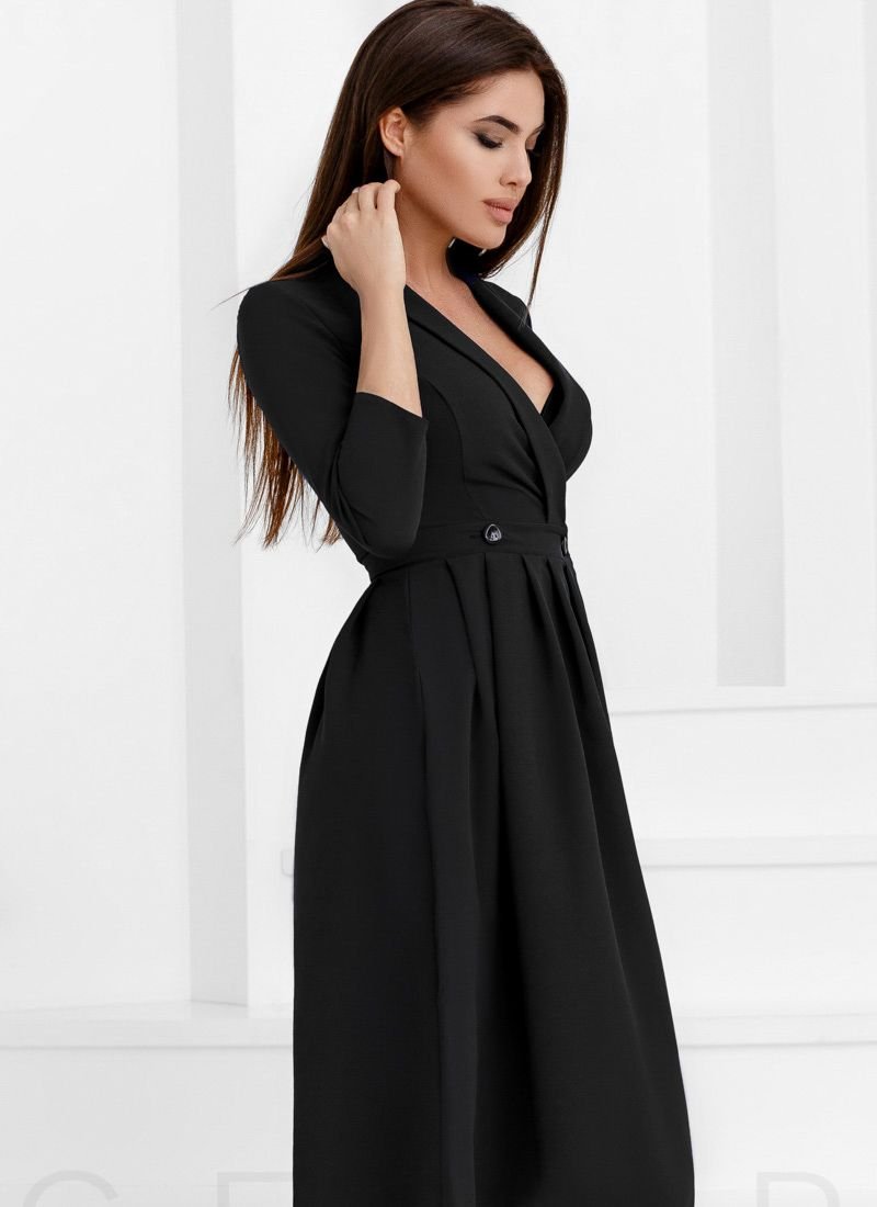 A dress for the smell in a business style: a tight 3/4 sleeve, a spectacular v-neck on the chest and a skirt with soft pleats and pockets in the seams.