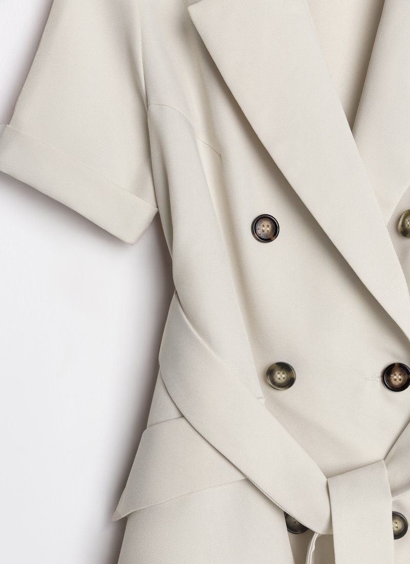 The original costume from Gepur designers, made of ivory-colored costume fabric: a double-breasted jacket with short sleeves, contrasting buttons and a removable belt to match, shorts with a high fit and lapels.