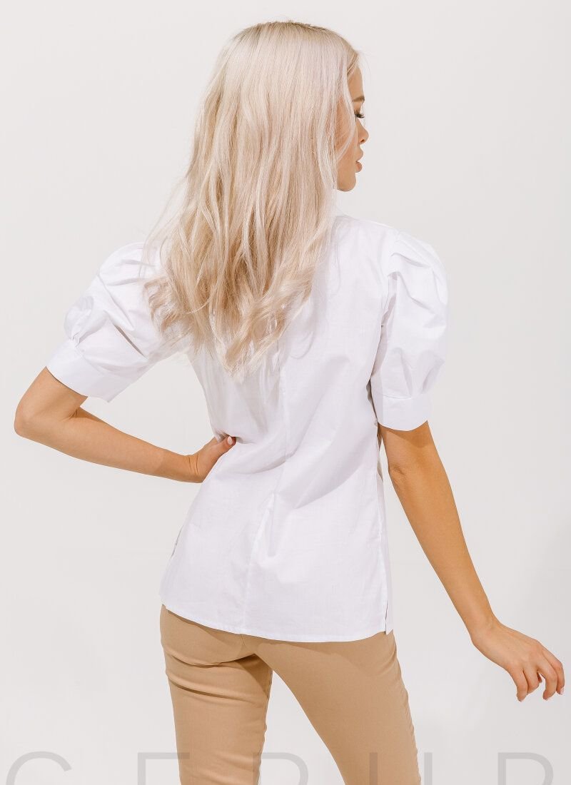 The basic shirt is white. V-shaped deep neckline, voluminous short sleeves with drapery. Straight cut, button placket in front.