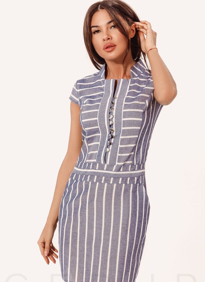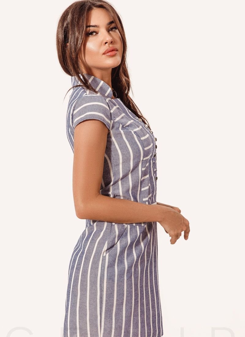Fitted dress in a striped print round neckline with stand-up collar, cap sleeves, strap with metallic buttons, set-in waist and a straight short skirt with two slash pockets at the sides.