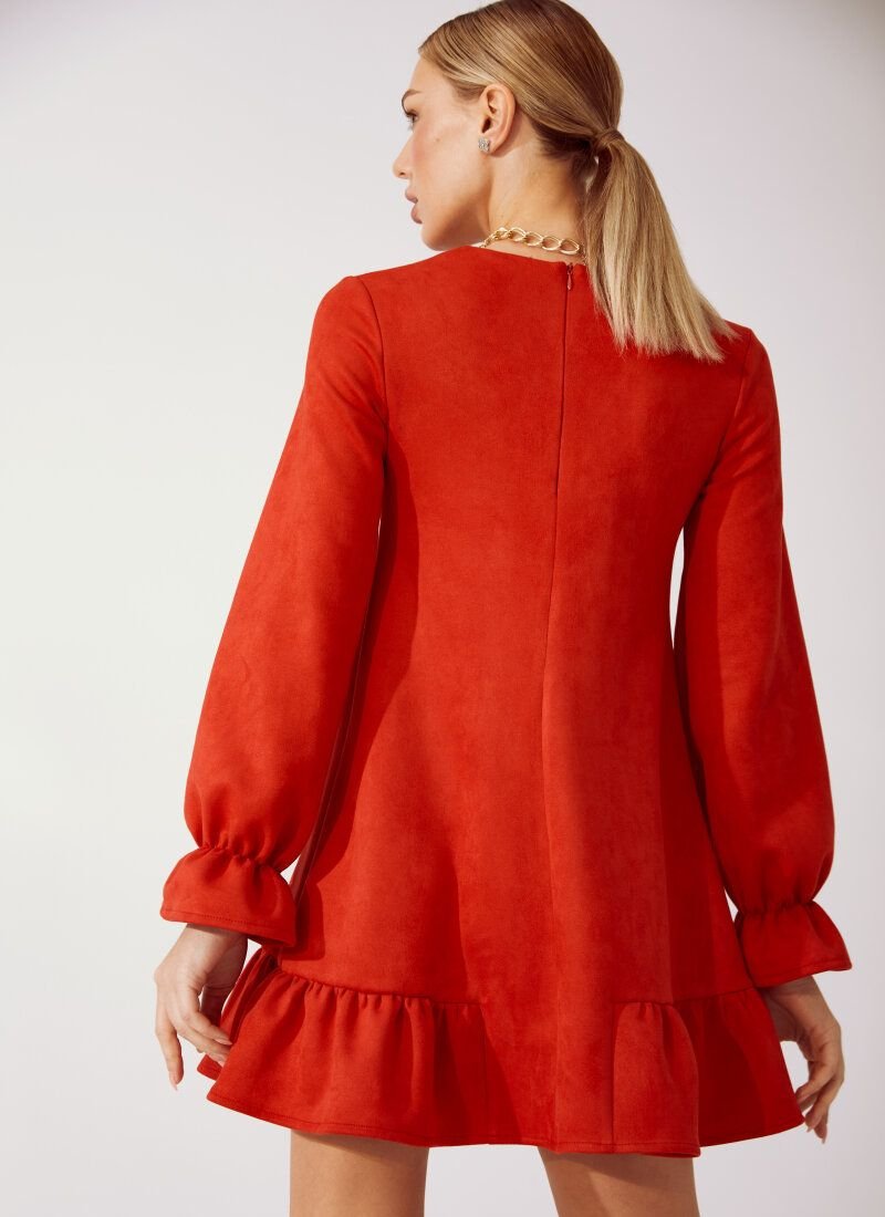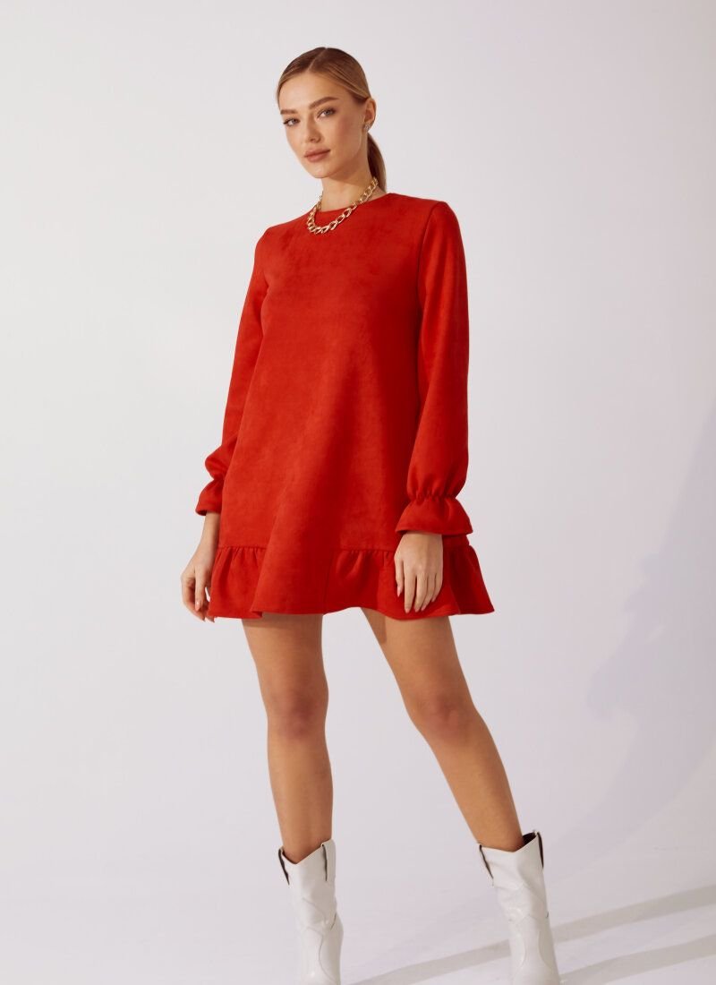 A mini dress equates beauty and convenience. The bright red color is invigorating, and the soft suede material fits nicely to the body. The model is complemented by a flounce at the hem and elastic cuffs on long sleeves. In combination with sneakers, such a thing will be an ideal example of what you can look feminine in shoes without heels.