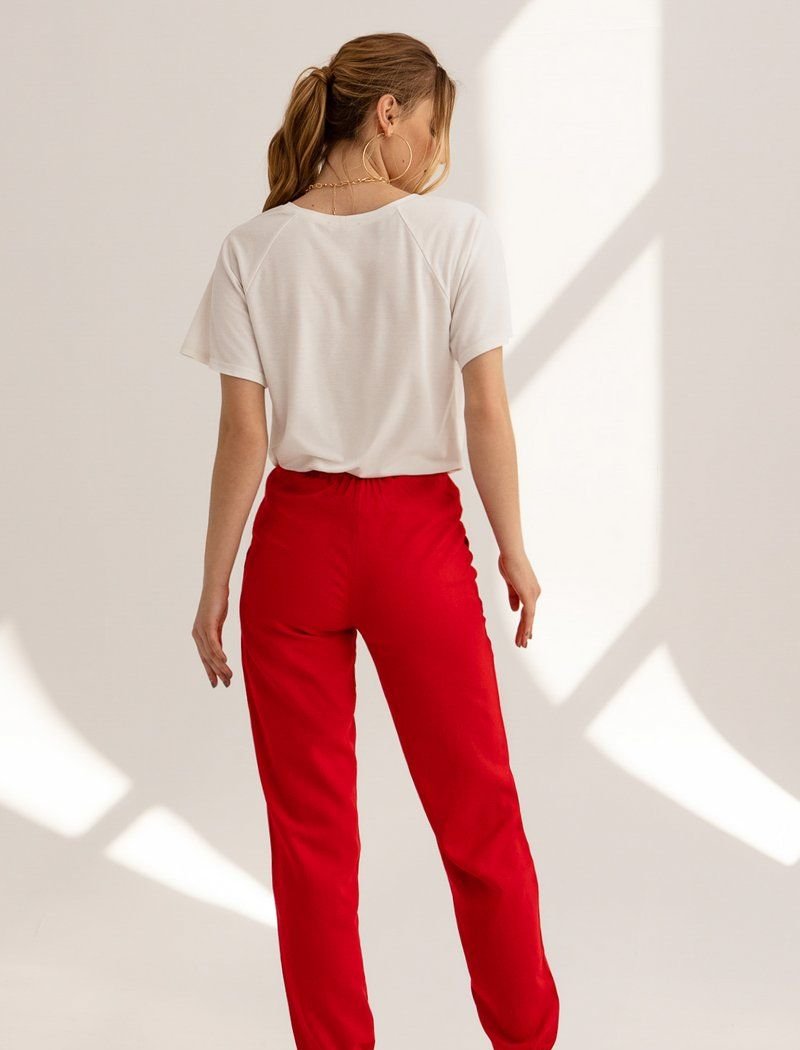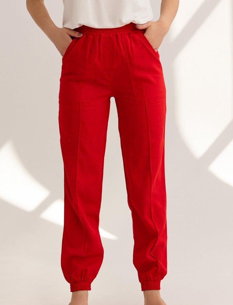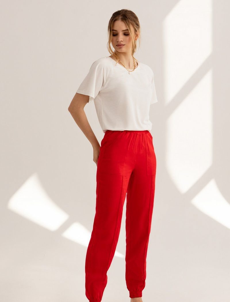 Red joggers with pockets and a wide elastic waistband are a good investment in the casual wardrobe of the spring-summer season. The legs were supplemented with fixed arrows that visually stretch the silhouette. For sewing the product, the designers used a thin, light material.