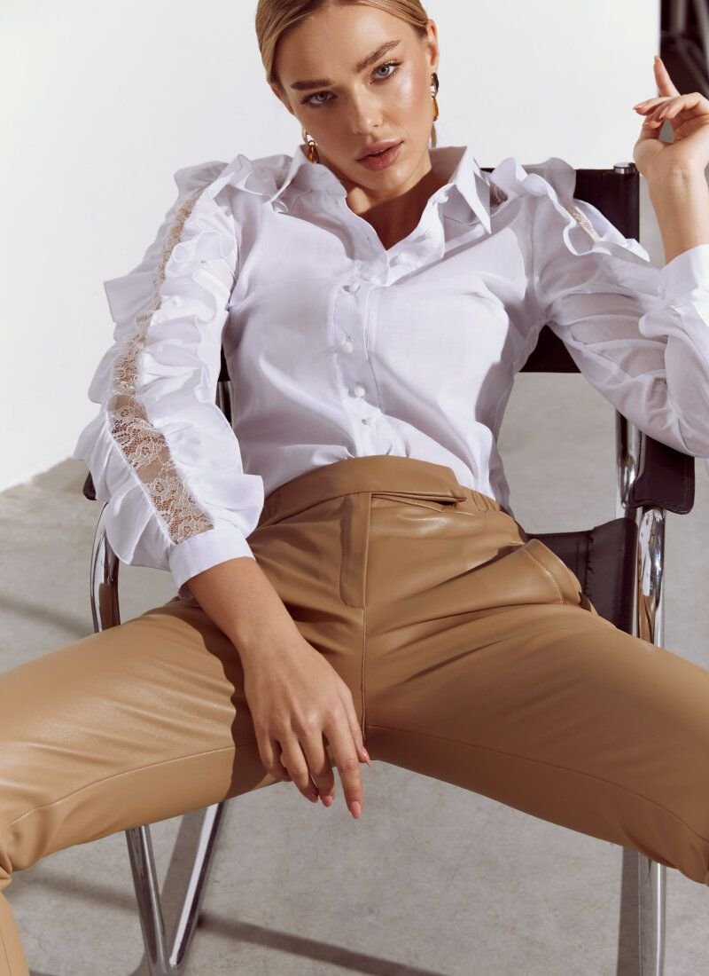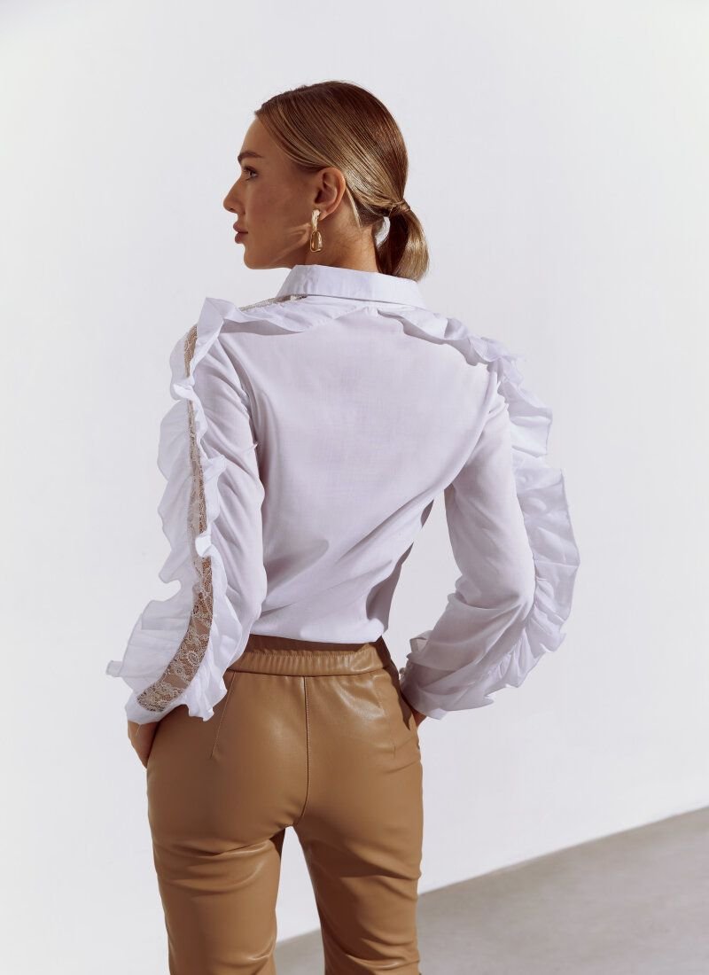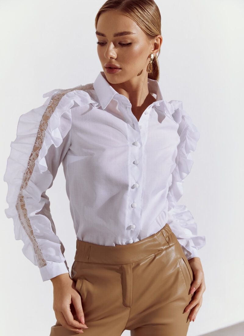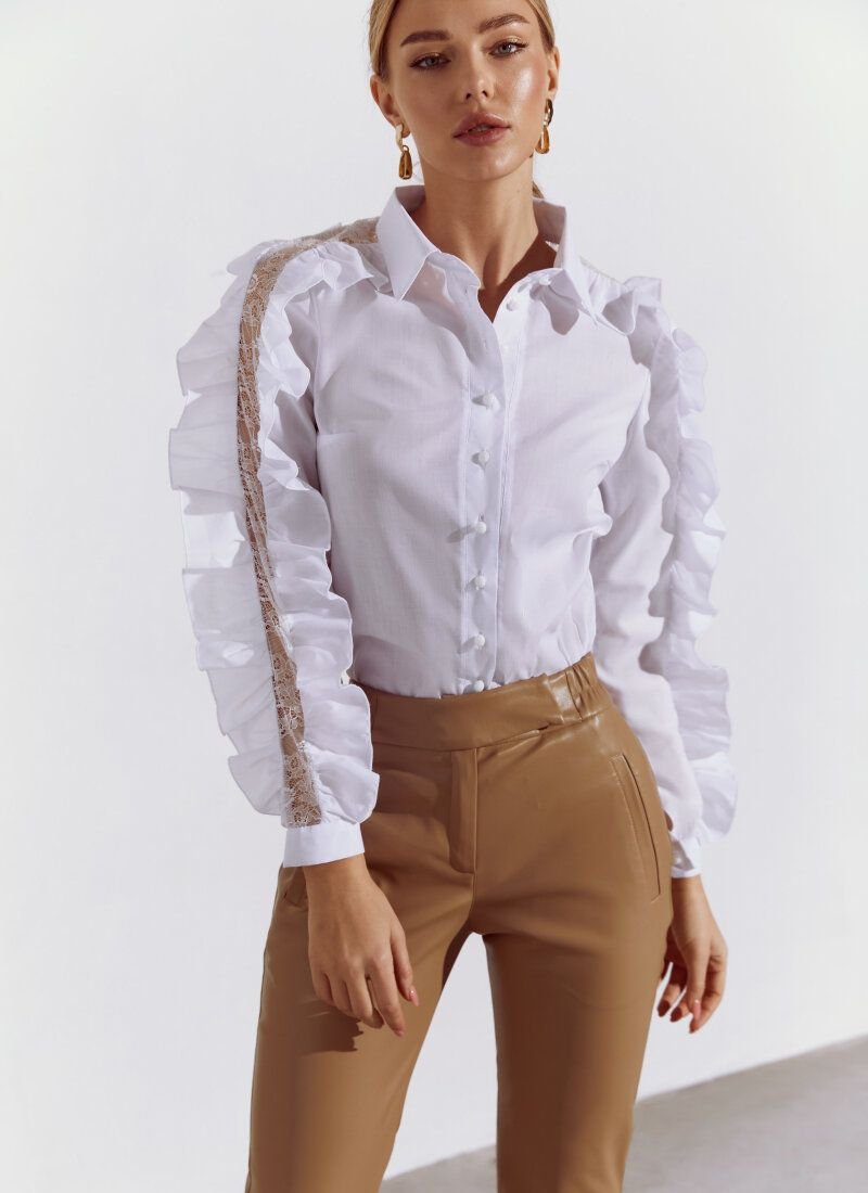 Despite the restrained white color, the blouse will solo in the image. The whole accent of the model consists in long sleeves with openwork inserts framed by flounces.