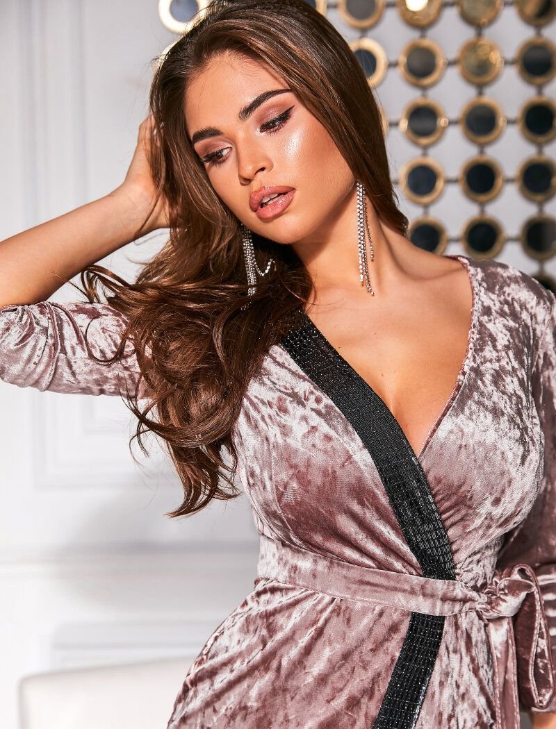 An evening short dress of a delicate shade for a fixed zap?x, complemented by a contrasting shimmering insert: a deep v-neck, long sleeves, a cut-off waist with an elastic insert, complemented by a removable belt.