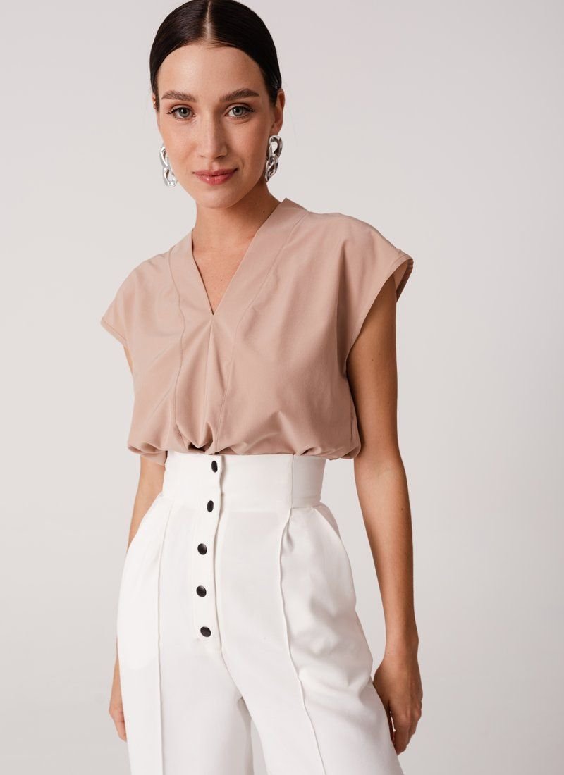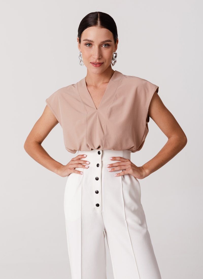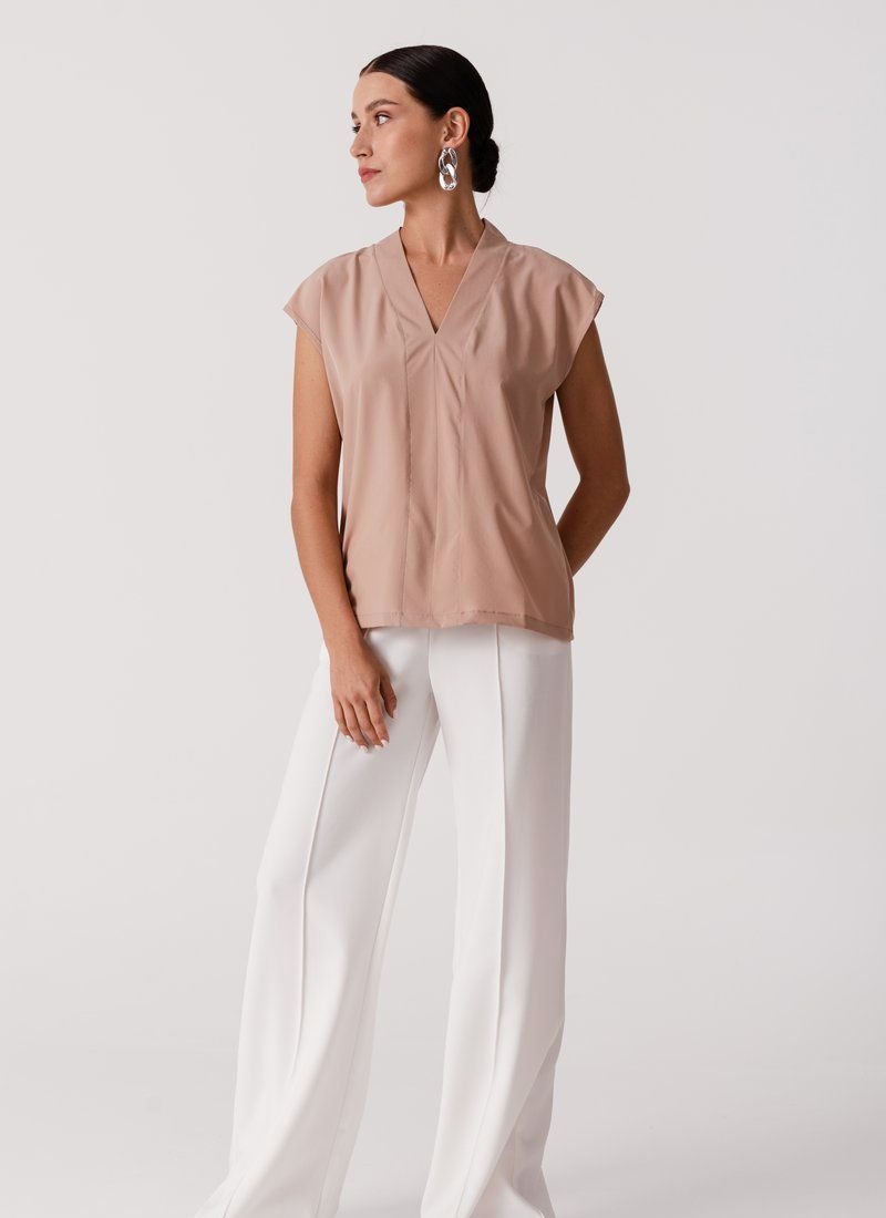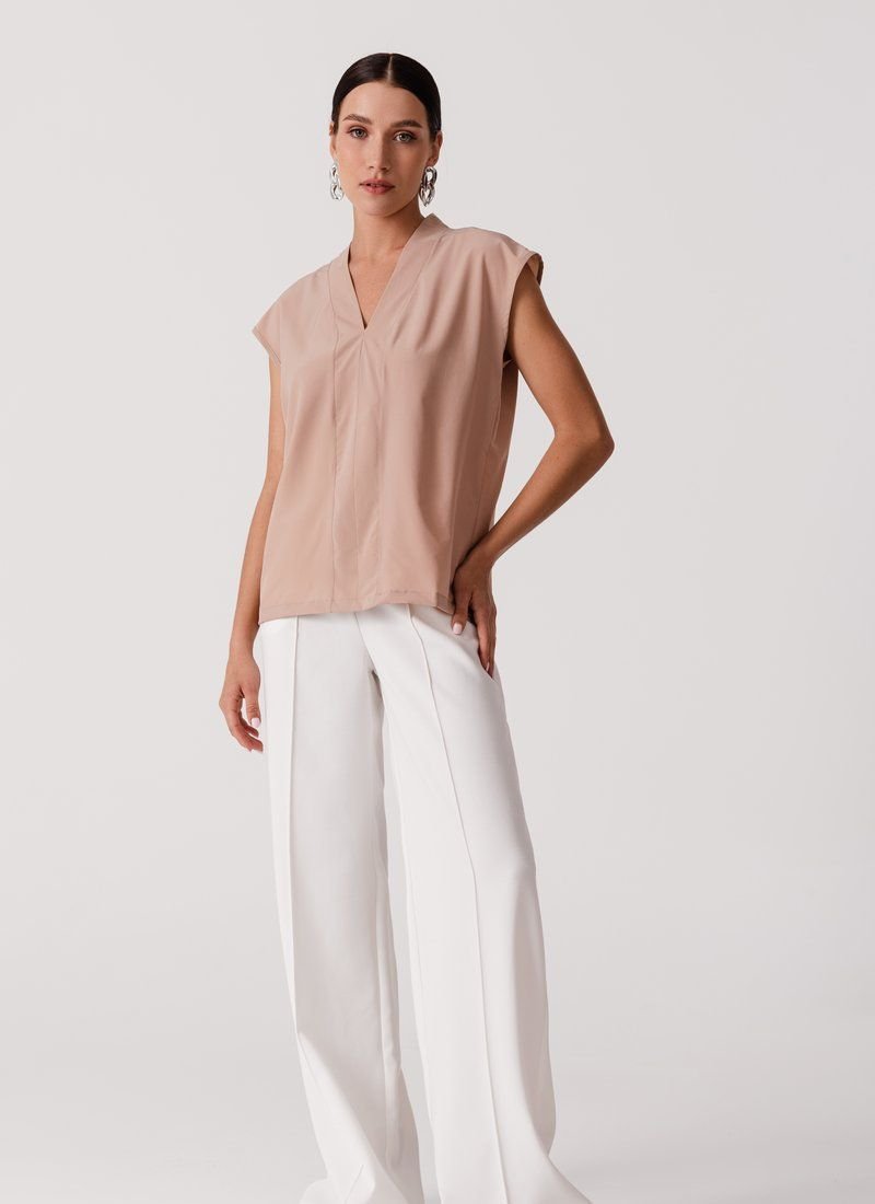 The loose cut and basic beige color make the blouse a universal wardrobe element. The model with a V-neck will easily complement the image in both business style and casual.