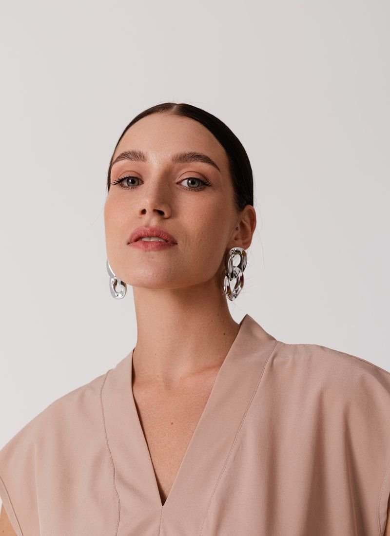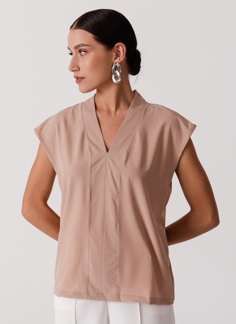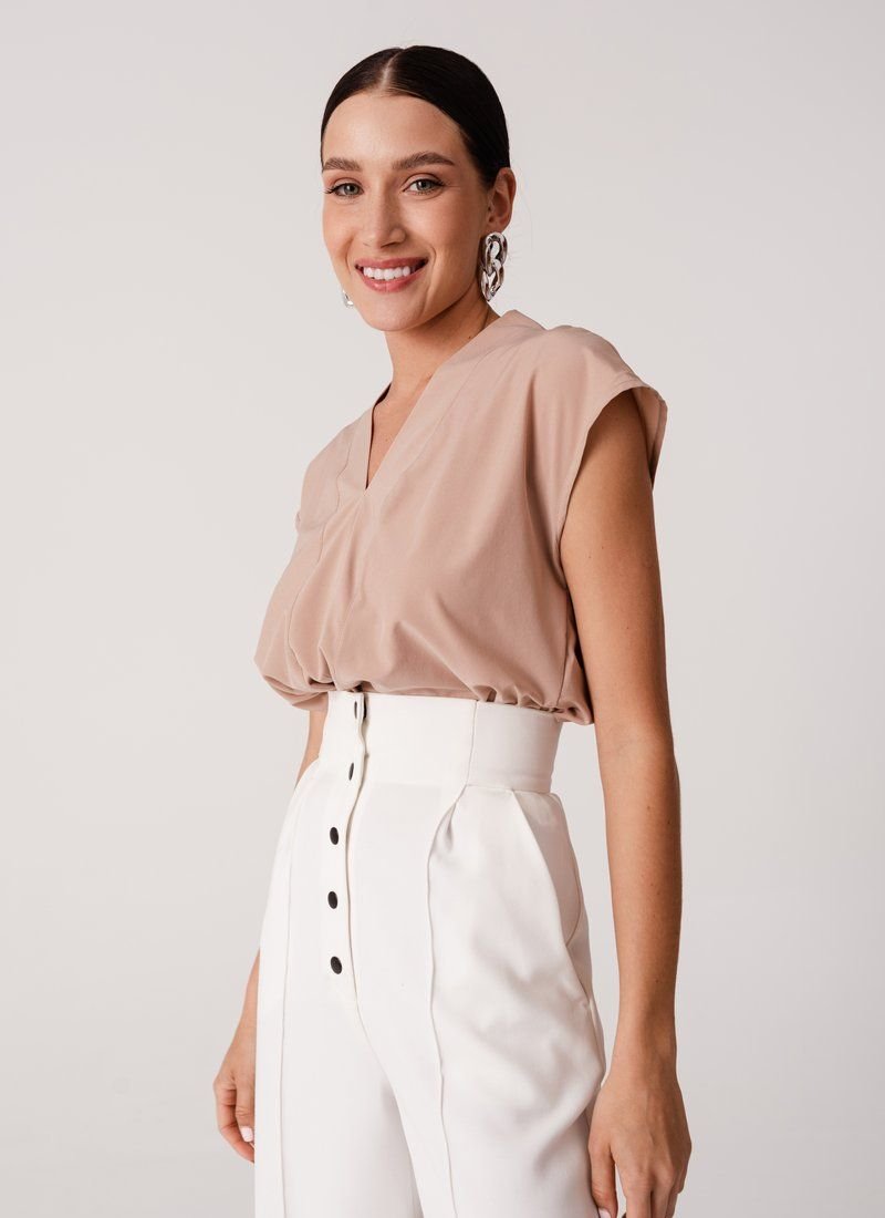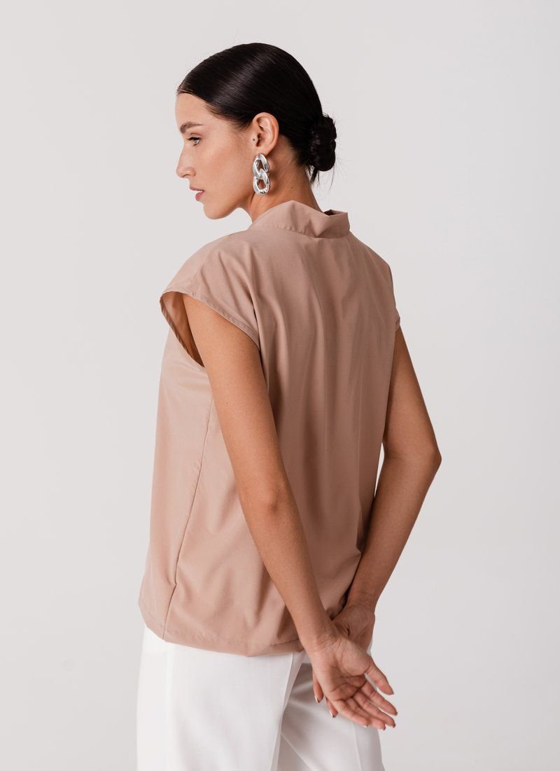 The loose cut and basic beige color make the blouse a universal wardrobe element. The model with a V-neck will easily complement the image in both business style and casual.