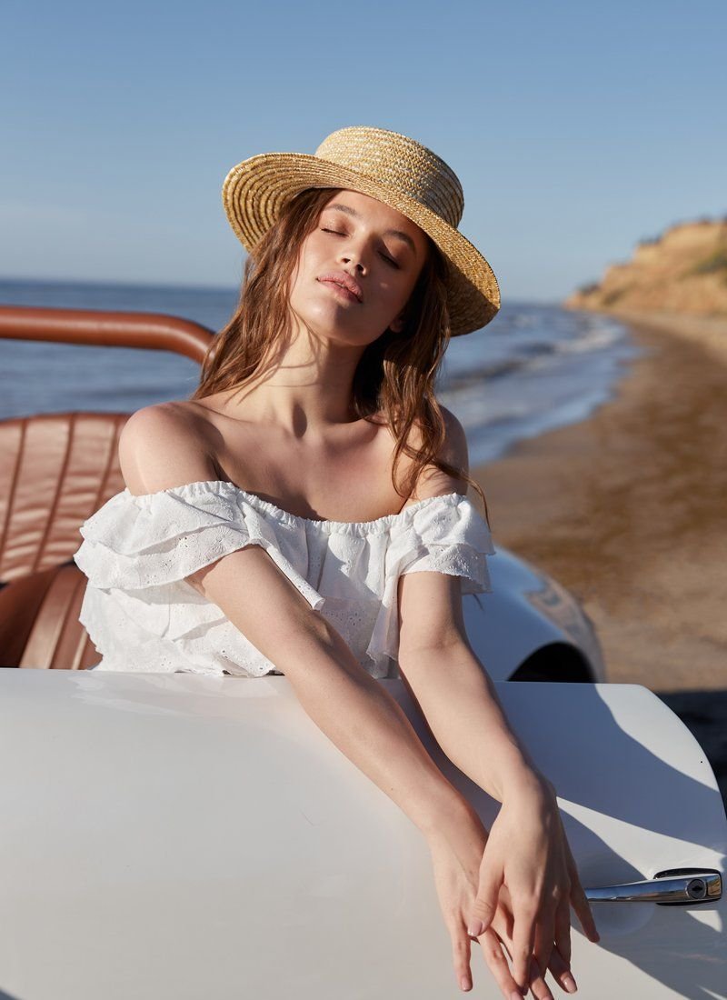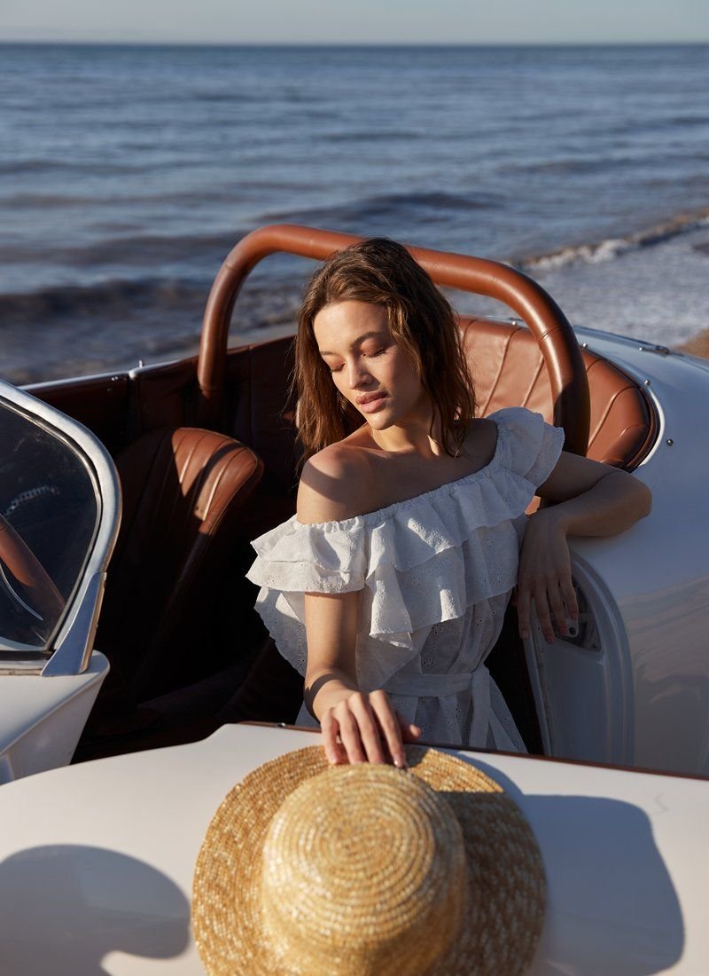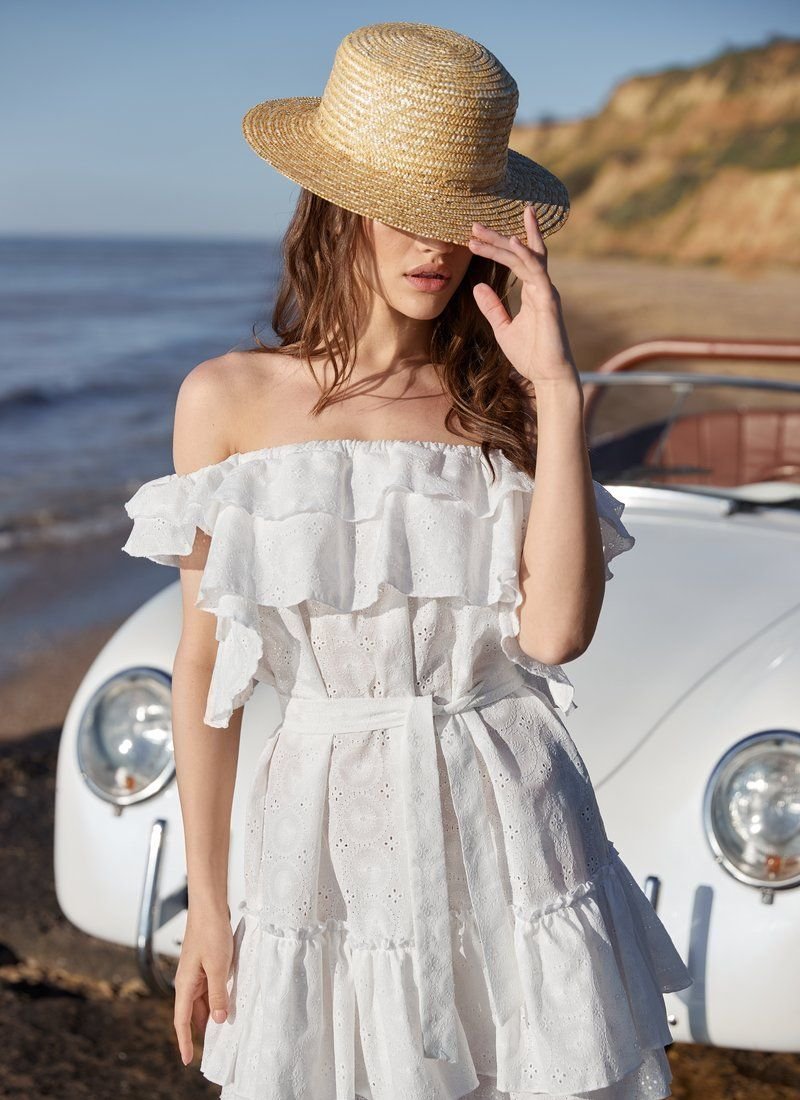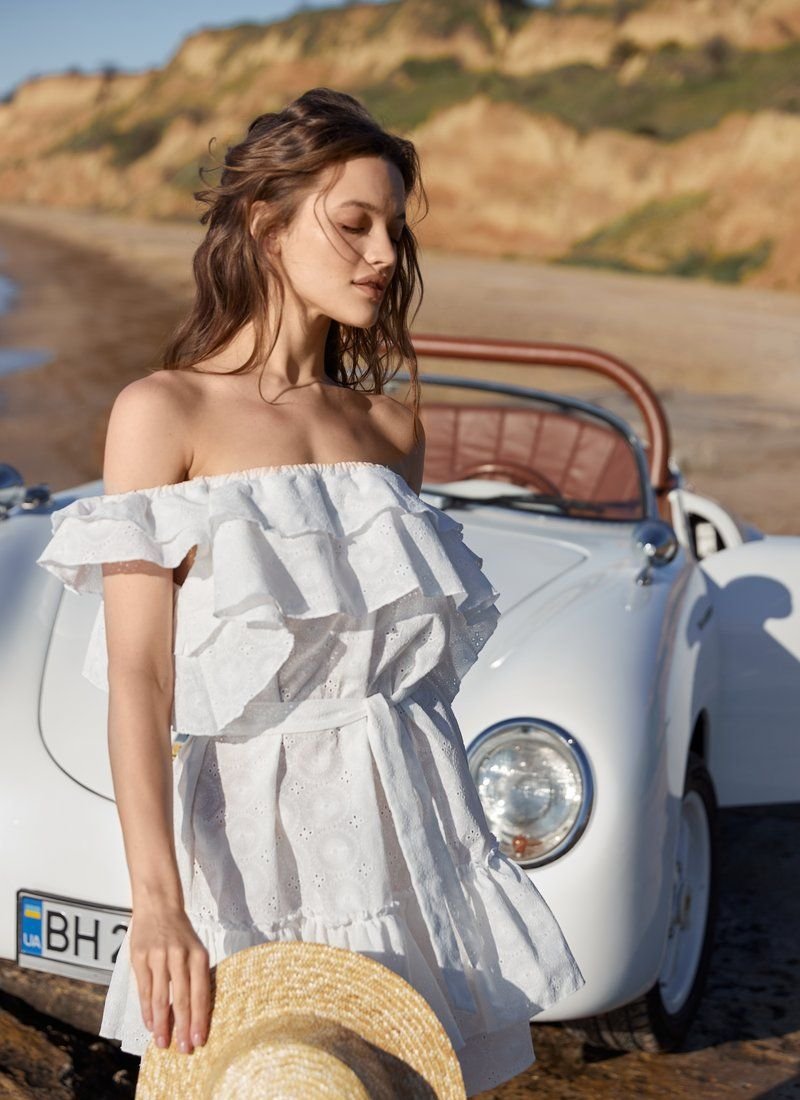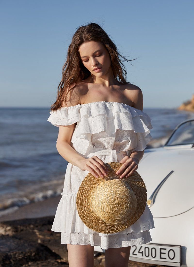 A short white dress will inevitably attract attention. The material with openwork embroidery, wide ruffles on the hem and the decollete area work for this. A belt-ribbon allows you to make the silhouette fitted.