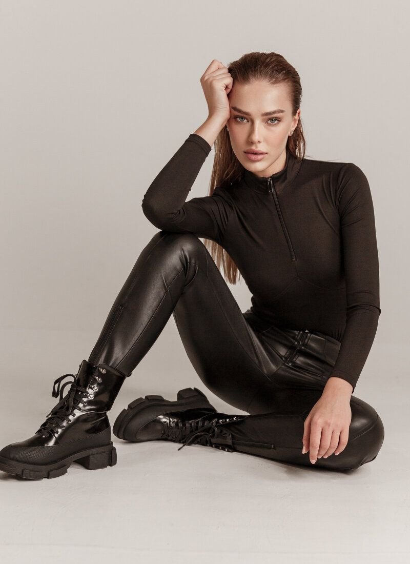 A black tight-fitting bodysuit will be a worthy alternative to a longsleeve in a casual look. The product with long sleeves is fastened with buttons. A zipper from the collar to the chest line acts as a laconic decor. The model is made of elastic material that repeats the curves of the figure.