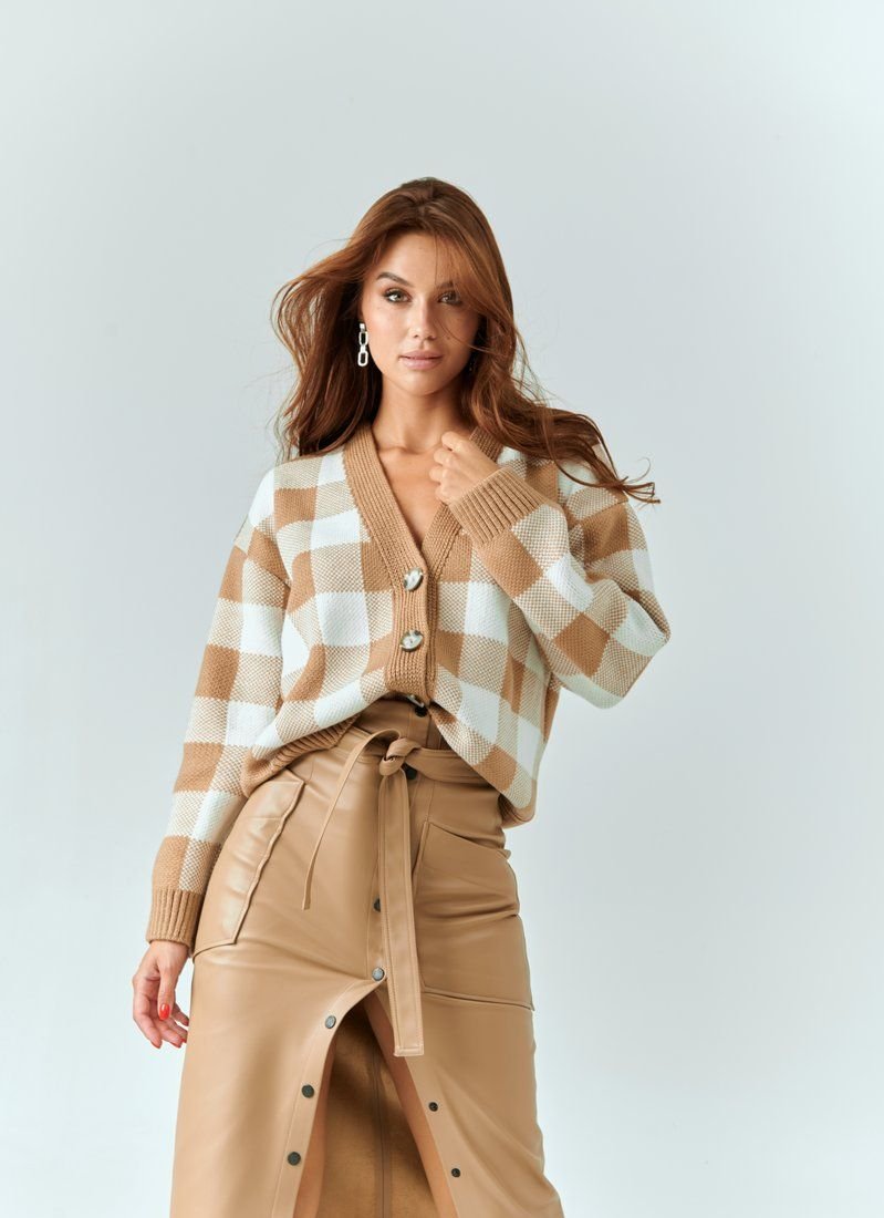Beige wool jumper in a large white check. In this model there are round sperdi buttons, which are stylized as a tree.