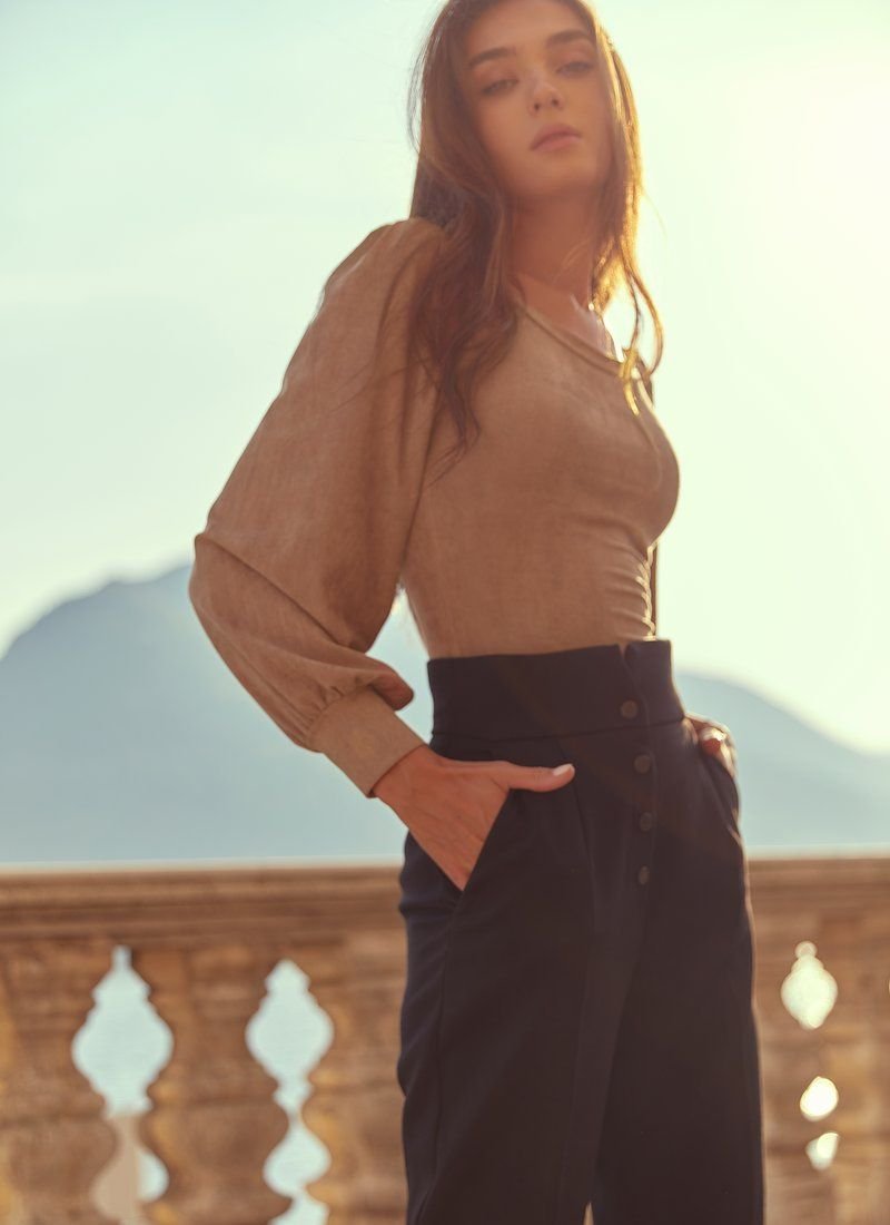 A solid beige jumper from Gepur designers organically supports the casual look. The model with a boat neck was made of a pleasant eco-suede material that fits nicely to the body. The jumper was supplemented with voluminous lantern sleeves. Please note that the shade has changed (09/20/2021).