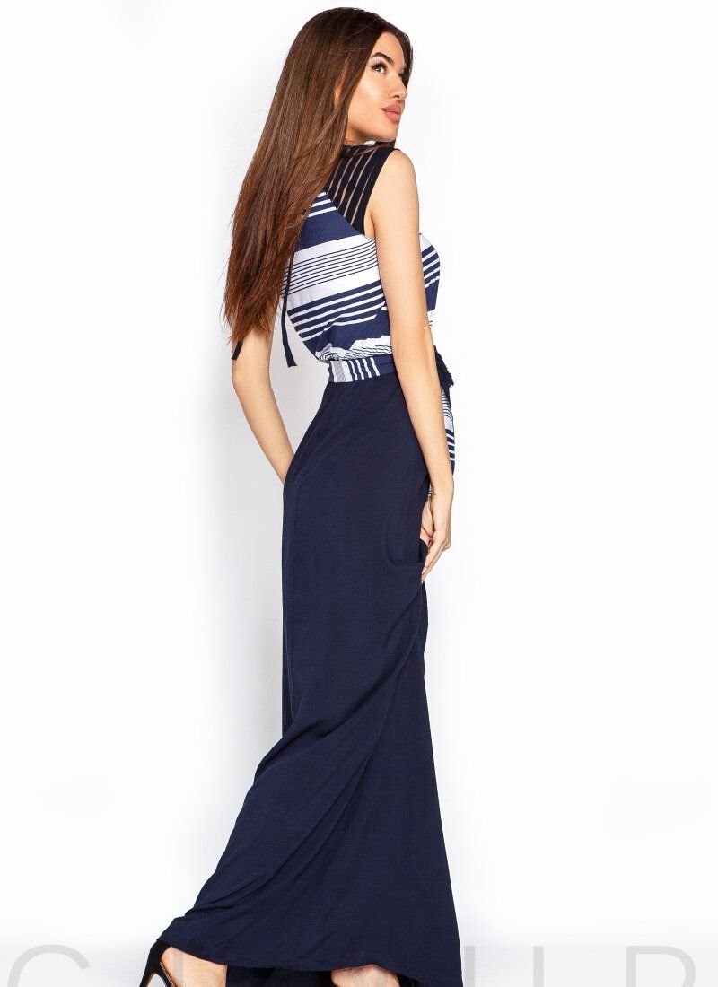Summer dress made of cotton fabric with transparent inserts on the shoulders, a small slit with ties on the back, a long plain skirt and a removable belt.