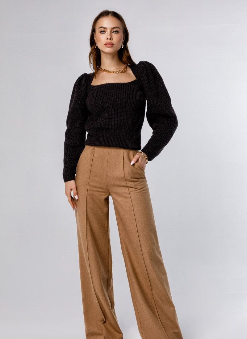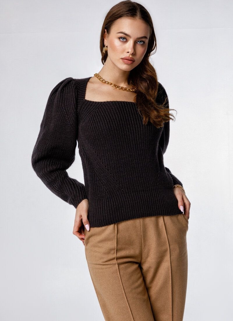 The basic black jumper is knitted from a mixed wool yarn - a soft and durable material. The model is complemented by voluminous sleeves with pinches on the shoulders. The fitted cut is formed by an elastic bottom edge.