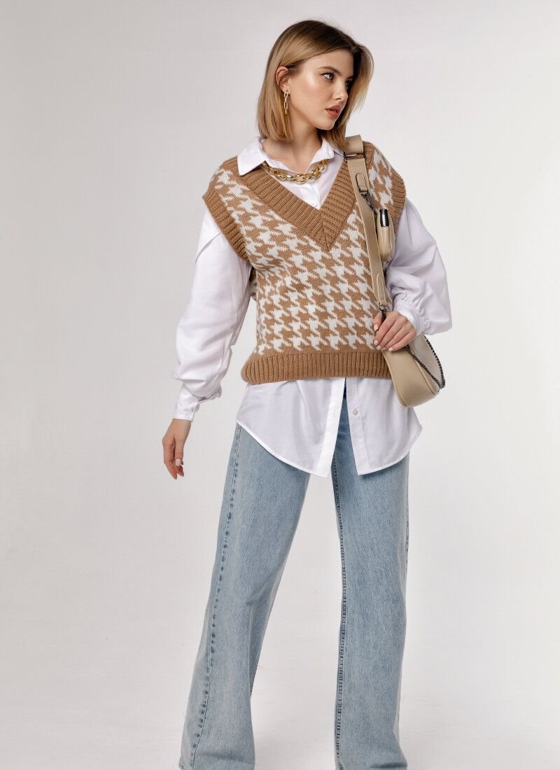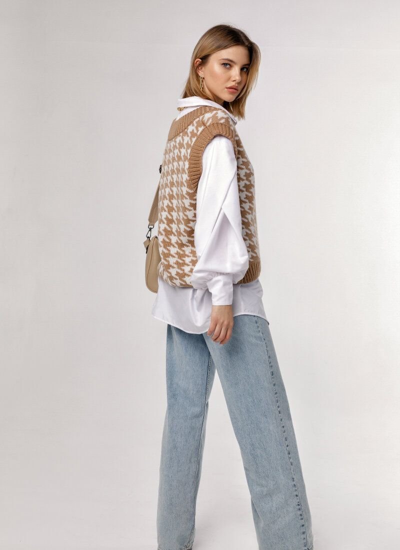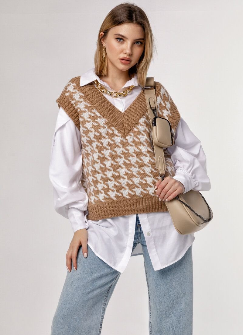 Knitted vest, as on models Prada, Dior, Marc Jacobs, Lacoste FW'20/21, acts as an ideal component of a multi-layered image. The product in a large print "crow's foot" is made of soft voluminous yarn with an admixture of wool.