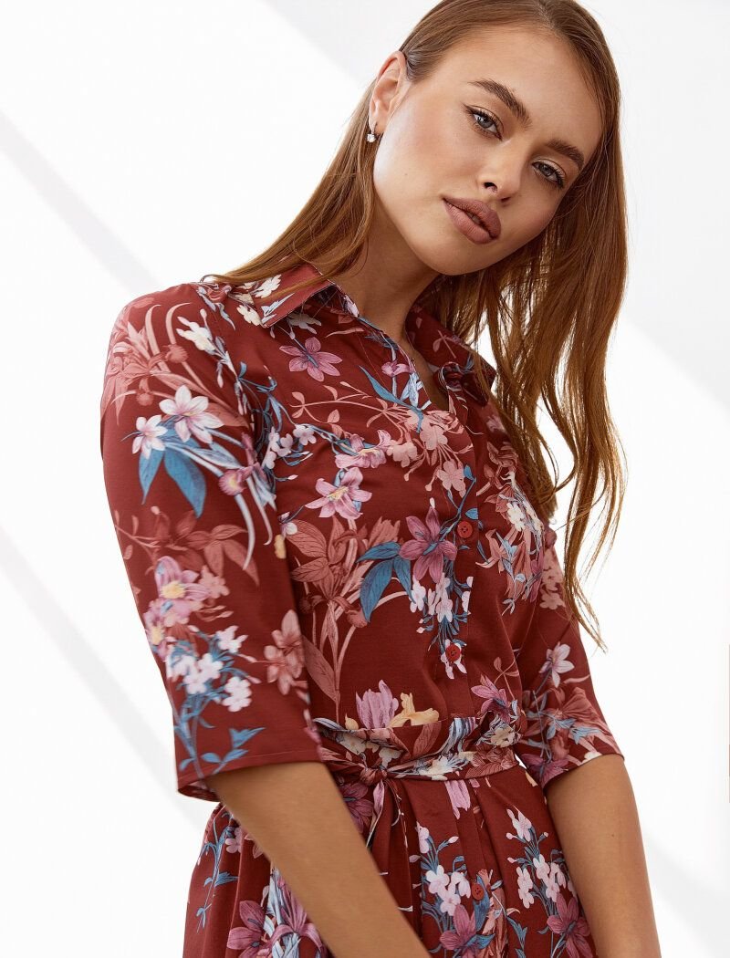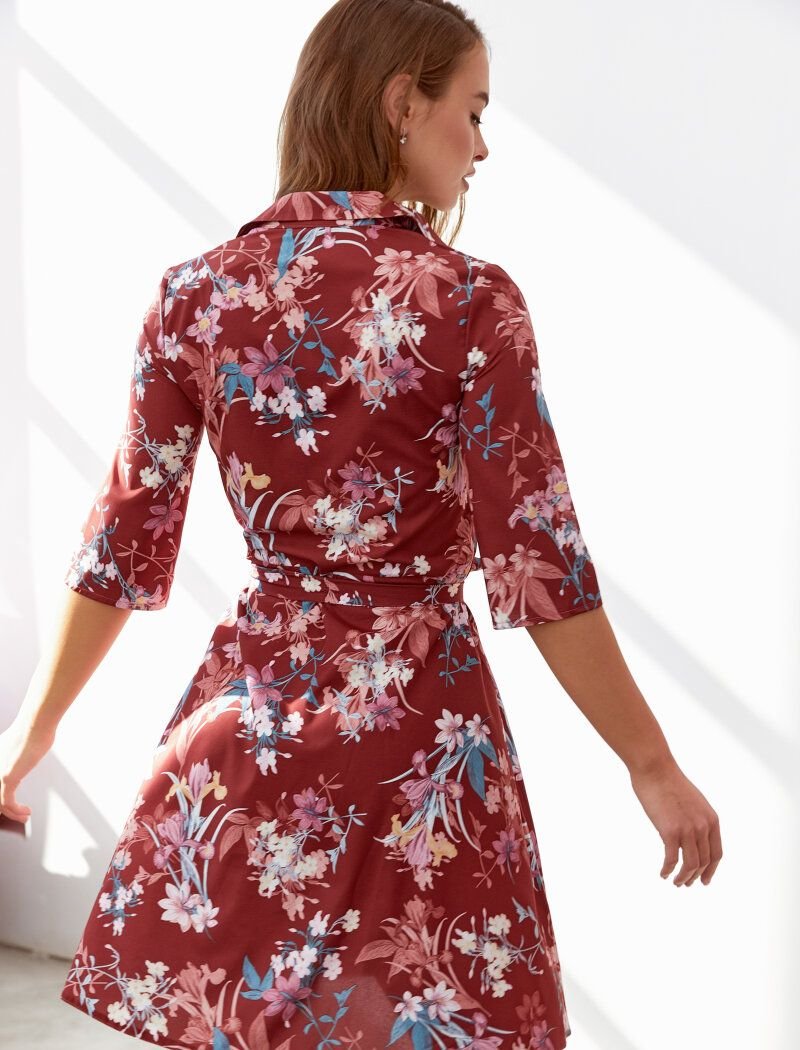 A burgundy mini dress is perfect for creating a bow in a romantic style. The shirt cut of the model with a cut-off waist and a removable belt was decorated with a trendy SS21 print according to Vogue-a large floral motif.