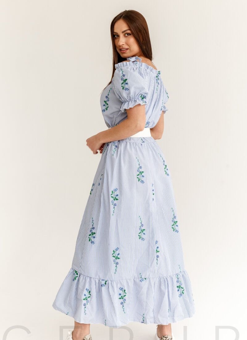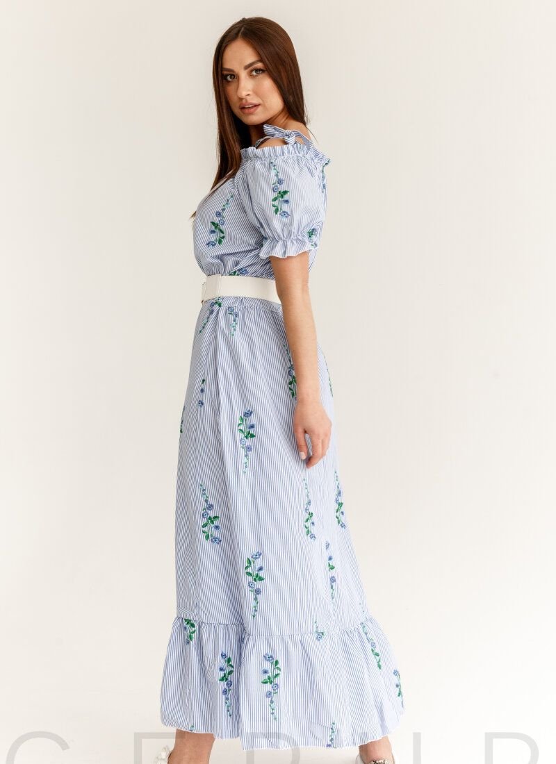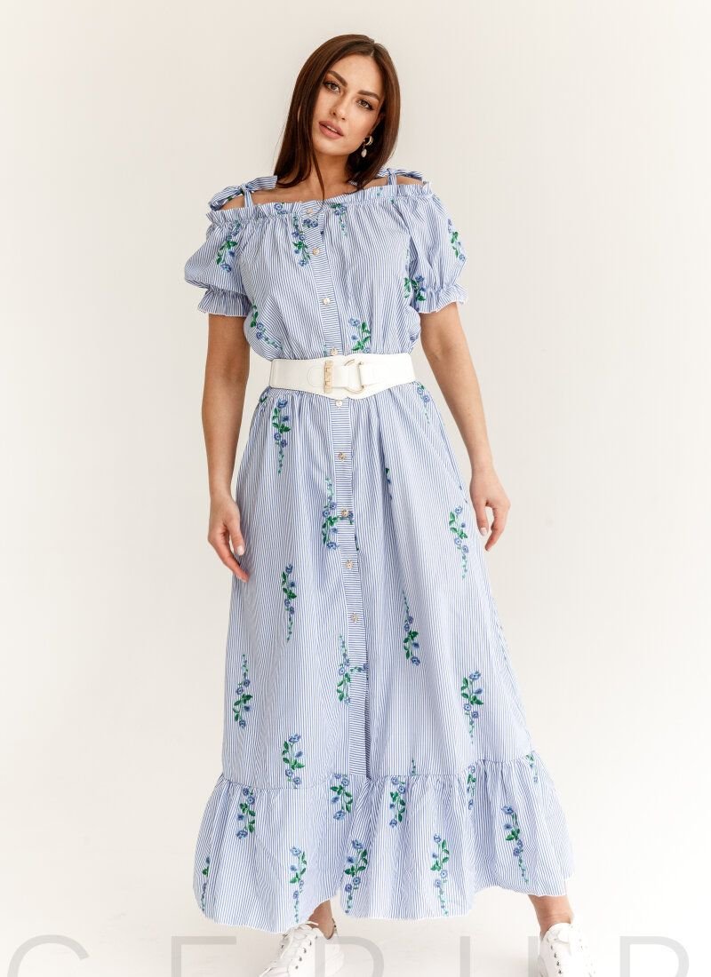 Maxi dress with striped print, complemented with embroidery. Open shoulders with fixed straps-ties, a short voluminous sleeve with a flounce. A button placket in front along the entire length, a sewn-in belt, a flared skirt in a light fold, complemented by a flounce.