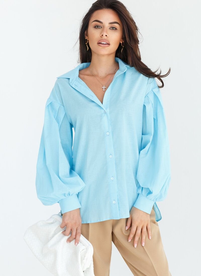 This lightweight shirt is not devoid of femininity, despite the loose fit. The turn-down collar is complemented by a button placket along the entire length. The volume of the sleeves is created by wide pinches on the shoulder line and cuffs. Small incisions are made on the side seams, which round the hem.