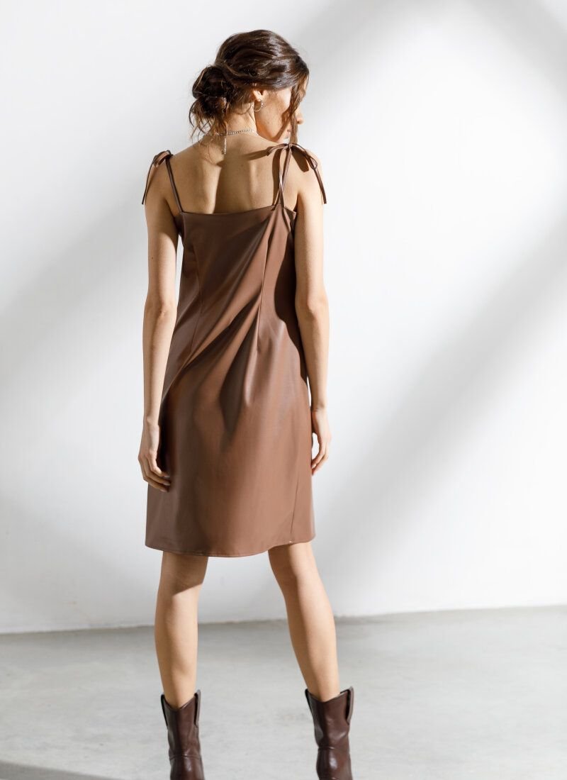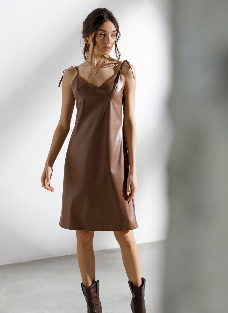 A sundress with thin straps made of smooth eco-leather supports the current trend for the SS’21 underwear style, which was supported by Valentino and Ermanno Scervino. The knit-based material fits nicely to the body.