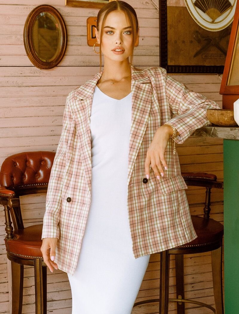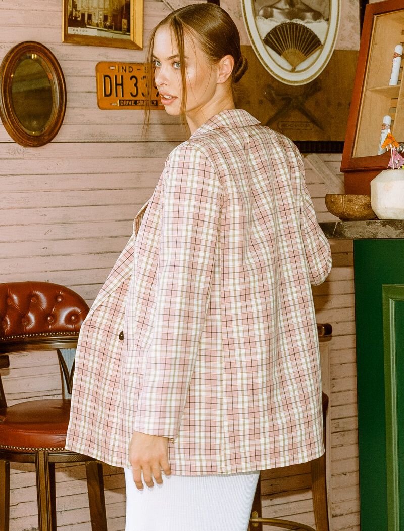 The double-breasted jacket corresponds to the fashion trends of 2020. The trendy checkered print in pink gives the classic cut an originality. Additional comfort is provided by welt pockets with flaps at the waist line.
