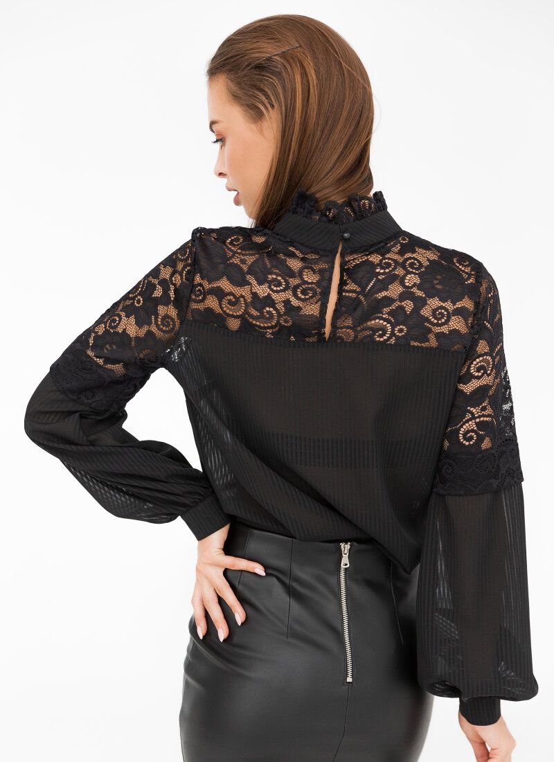 A black blouse made of light chiffon looks romantic. The right mood is set by a lace yoke and voluminous sleeves with cuffs. The stand-up collar is also complemented by a frill of openwork material.