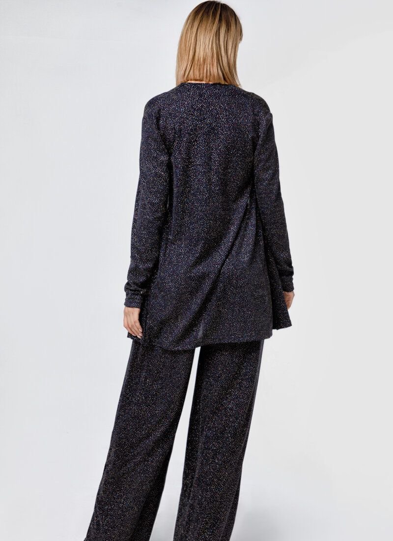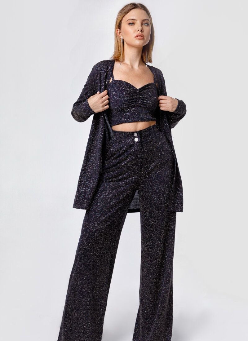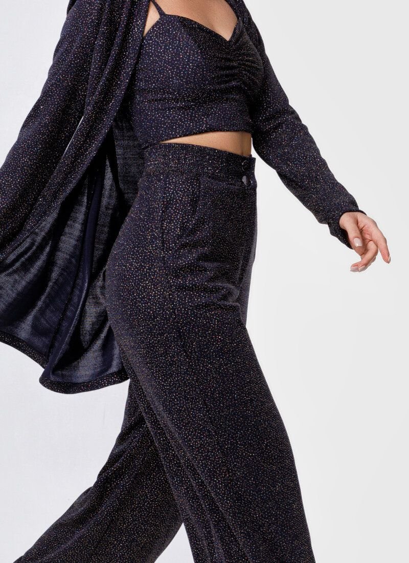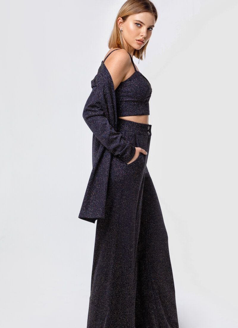 A blue suit with shimmering dusting is a win-win solution for creating a spectacular evening look. The set consists of three elements: palazzo trousers, a top with thin straps and a loose cardigan. Elastic inserts provide a comfortable fit on the figure. The trousers are complemented by side pockets.