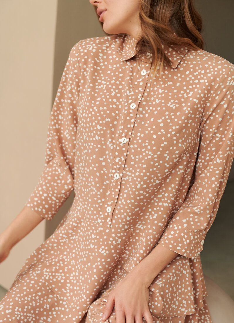 The laconic cut of the beige dress was compensated by color and accent print. The chaotic motif brings a touch of relaxation to the image. Stylized under a shirt with 3/4 sleeves, the bodice was complemented with a voluminous two-tiered skirt.