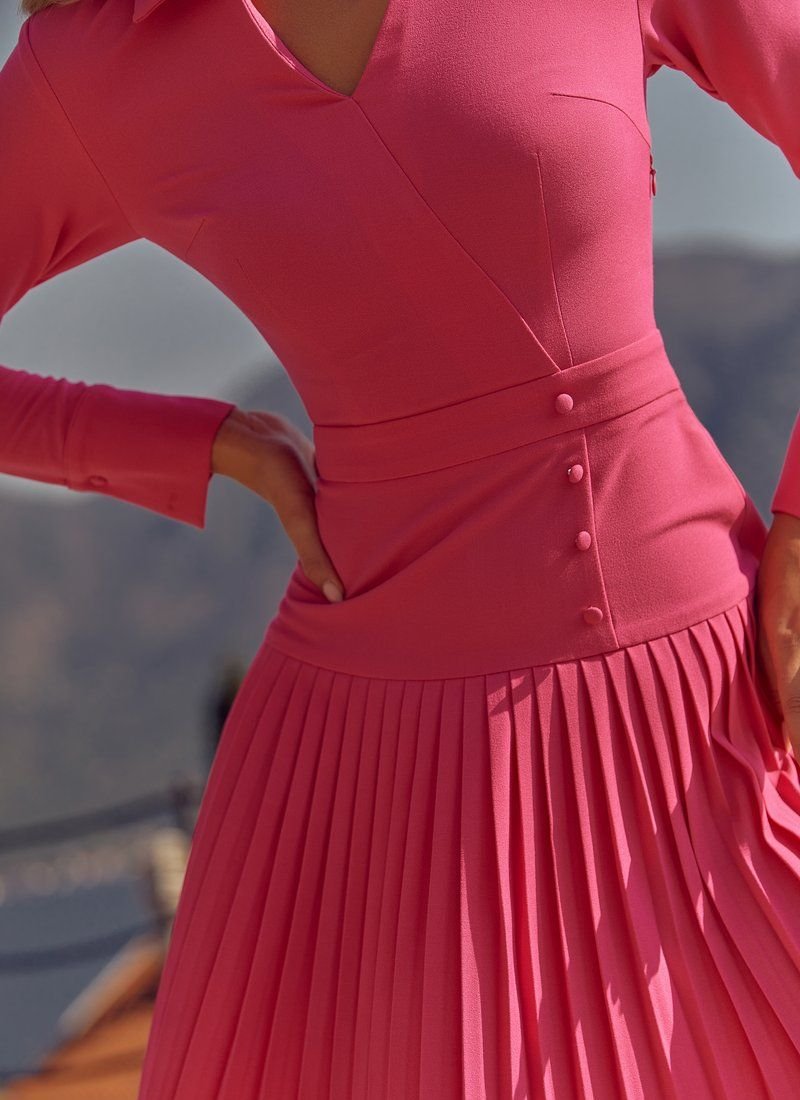 A bright crimson dress made of suit fabric, fitted cut, decorated by Gepur designers with pleating. The product has a V-neck, long sleeves. hidden zipper on the side for convenience.
