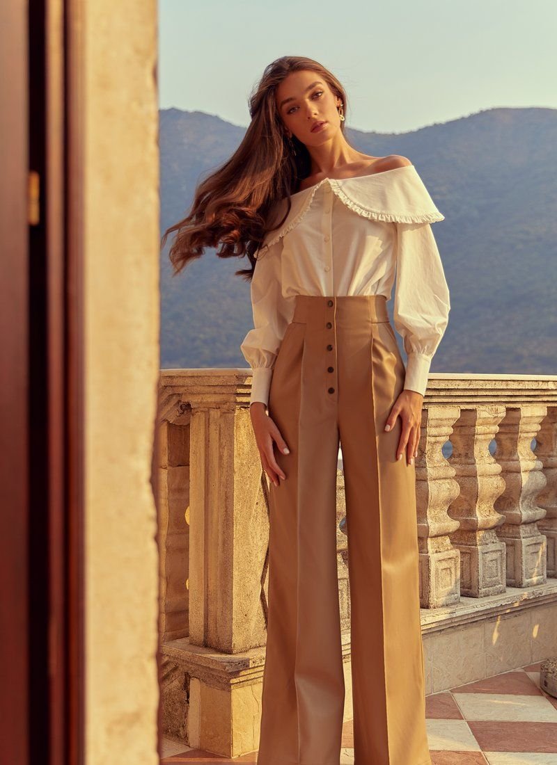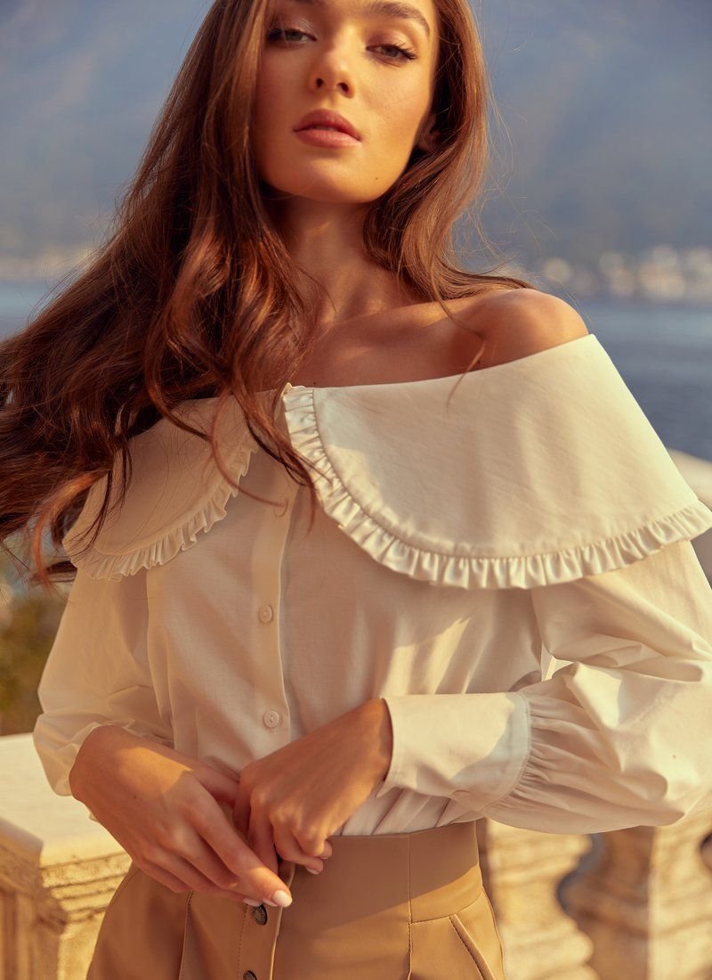 A blouse made of blended cotton with open shoulders will look great with both trousers and jeans. The product is presented in a loose cut with voluminous sleeves, which adds airiness to the image.