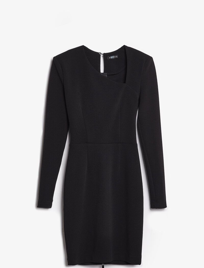Black color, laconic cut and long sleeves: the dress made of soft elastic fabric looks as restrained as possible. The entire semantic load is assumed by the curly cutout. The model was supplemented with a zipper at the back along the entire length, which serves not only as a fastener, but also acts as a decorative element.\nThe collection was presented by the finalist of Miss Ukraine 2015, a popular Instagram blogger and it-girl-Krystal Victoria.