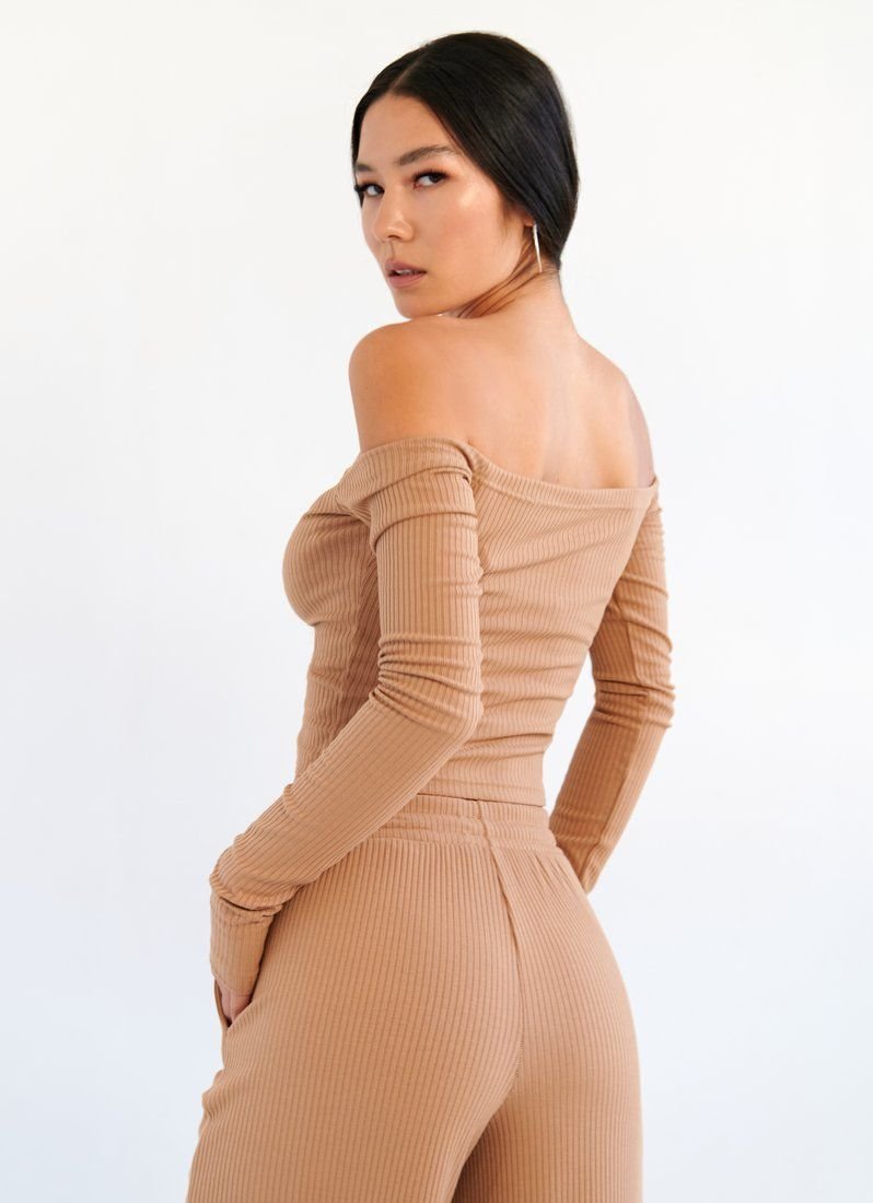Beige knitted suit with a top and trousers. In this model, the top will become the accent of the image due to the open shoulder line and drapery along the center of the product. Wide trousers with an elastic insert in the waistband will be as comfortable as possible for you.