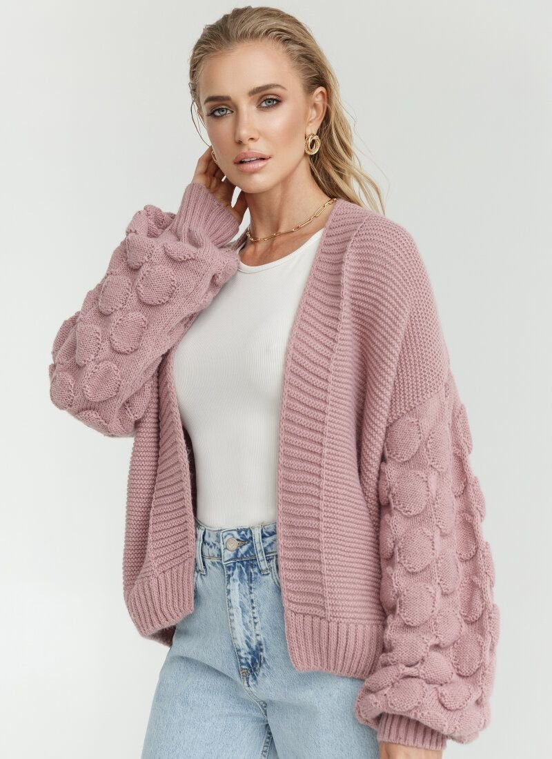 In the cool autumn, you can not do without a warm knitted cardigan. The model of the shortened cut is made of blended yarn. The originality of the style is given by voluminous sleeves on the cuffs with a large textured binding.