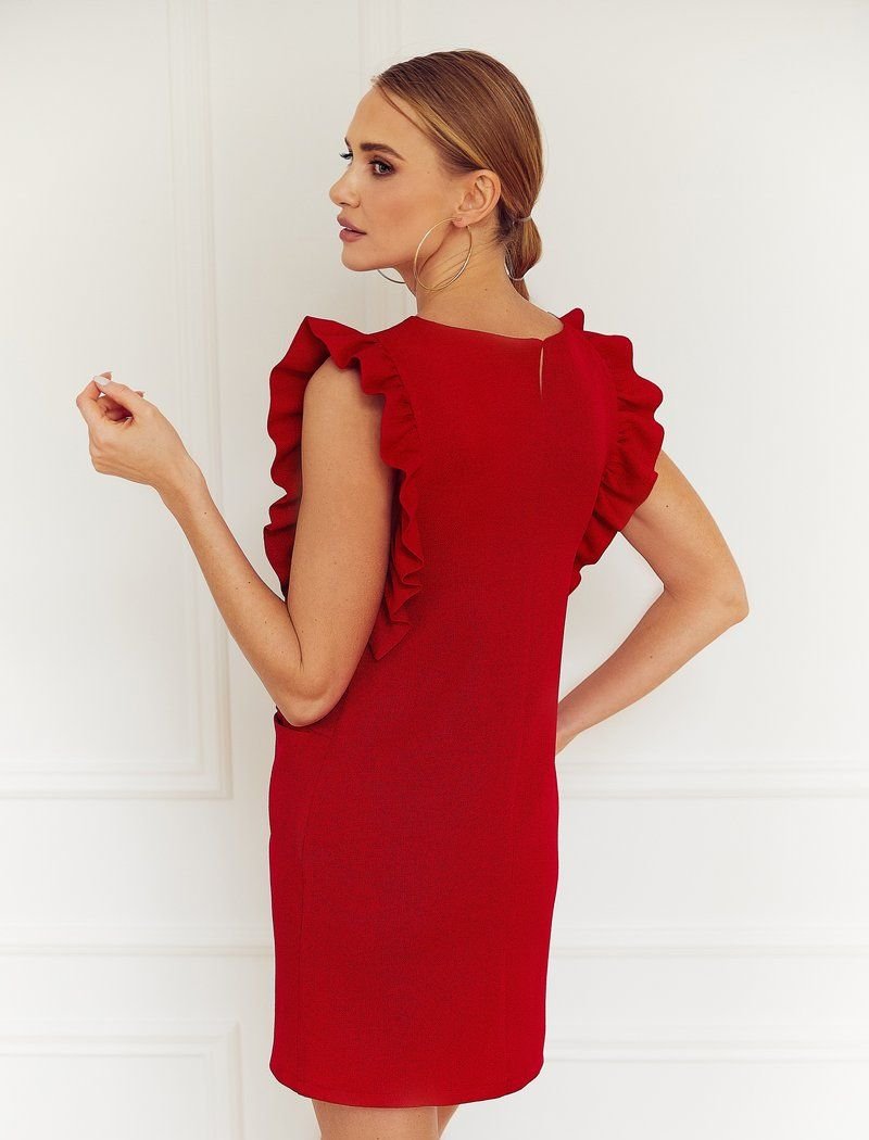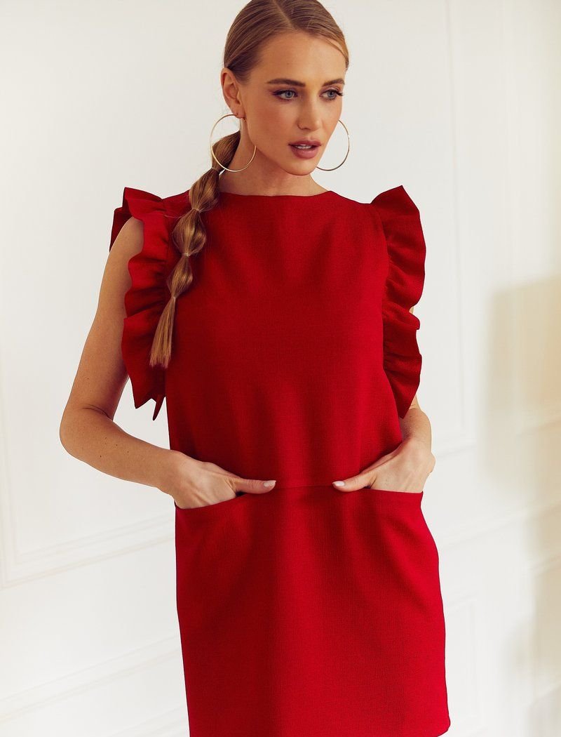 The red dress with a straight cut turned out to be romantic in a girlish way. For sewing a model with ruffled sleeves and sew-in pockets on the waistline, artificial linen was used, which is characterized by a non-uniform texture.