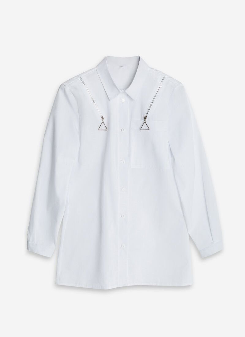 Cotton with cotton was used to create a white shirt, so the model turned out to be pleasant to the body. The product of a classic cut with a turn-down collar was decorated with decorative zippers.