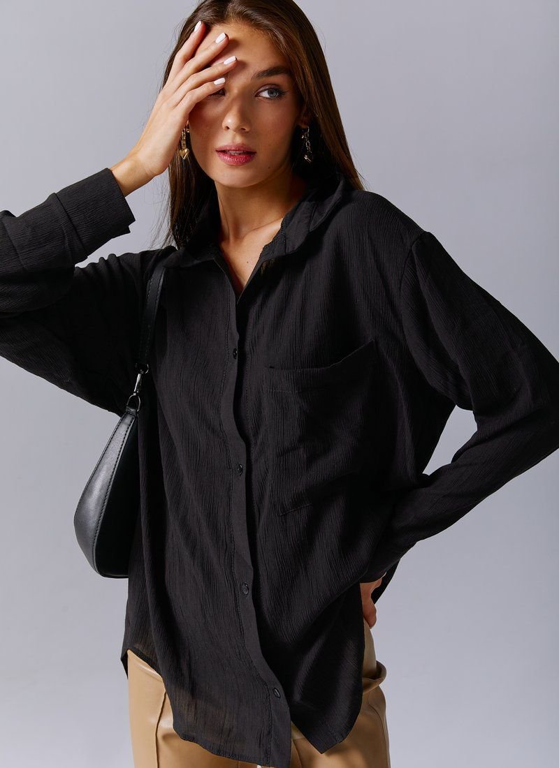 The classic black shirt is made of a chiffon header material. The model is cut oversize, long sleeves at the cuffs, buttons in front, turn-down collar. The shirt can be worn both with trousers and jeans, as a separate element, or in combination with tops or jumpers.