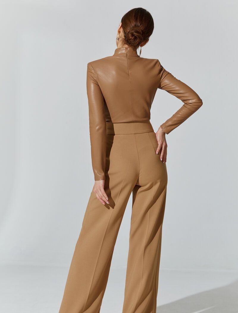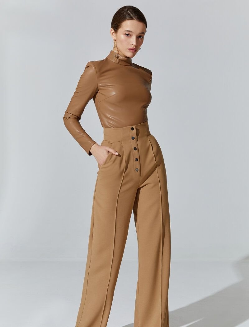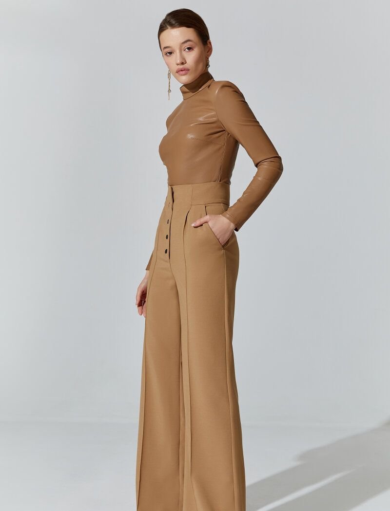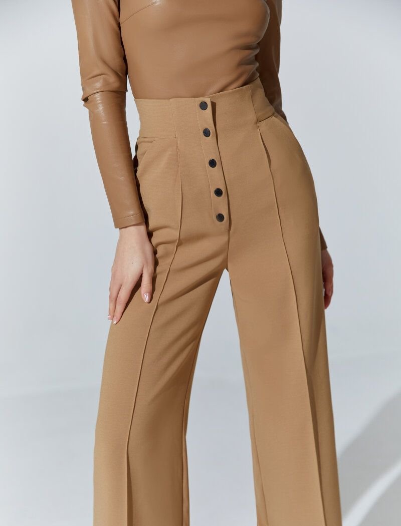 The trend for wide trousers in the SS'21 season was supported by Balenciaga and Louis Vuitton. The model in the basic beige color was made of a dense suit fabric that holds its shape well. A high fit and a button closure at the front accentuate the waist. The product was supplemented with side pockets. The face of the collection was the winner of the Eurovision Song Contest 2016, Ukrainian solo artist-Jamala
