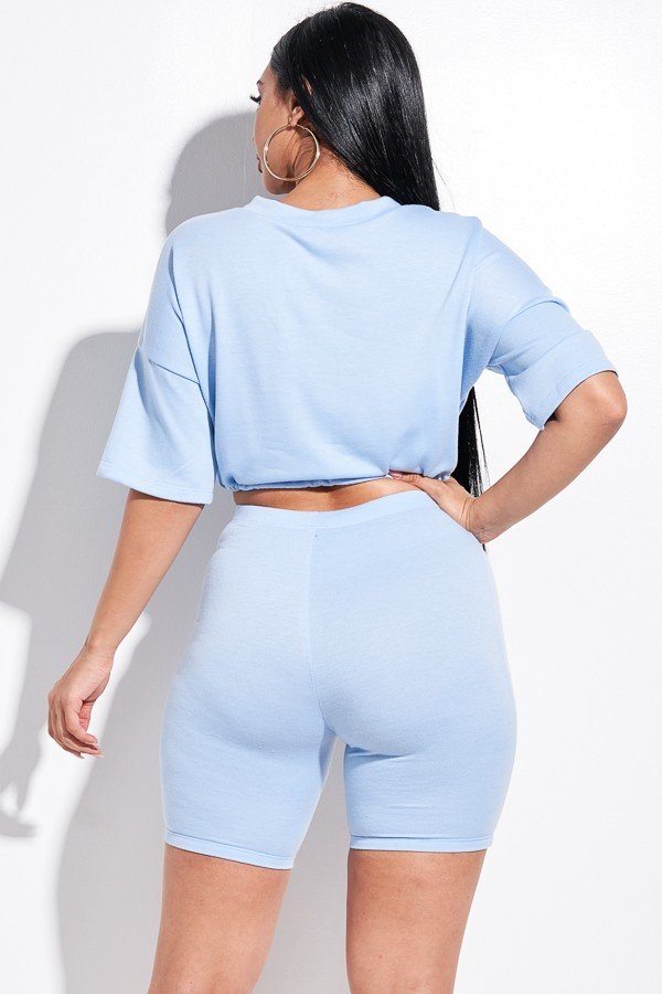 Made In U.S.AS.M.Lsolid french terry short sleeve tie front top and biker shorts 2 piece set96% Polyester 4% SpandexYellowMIS