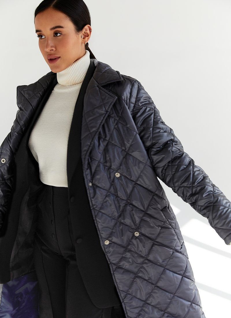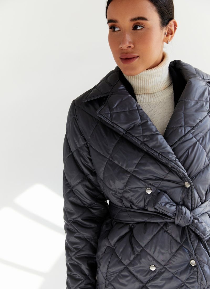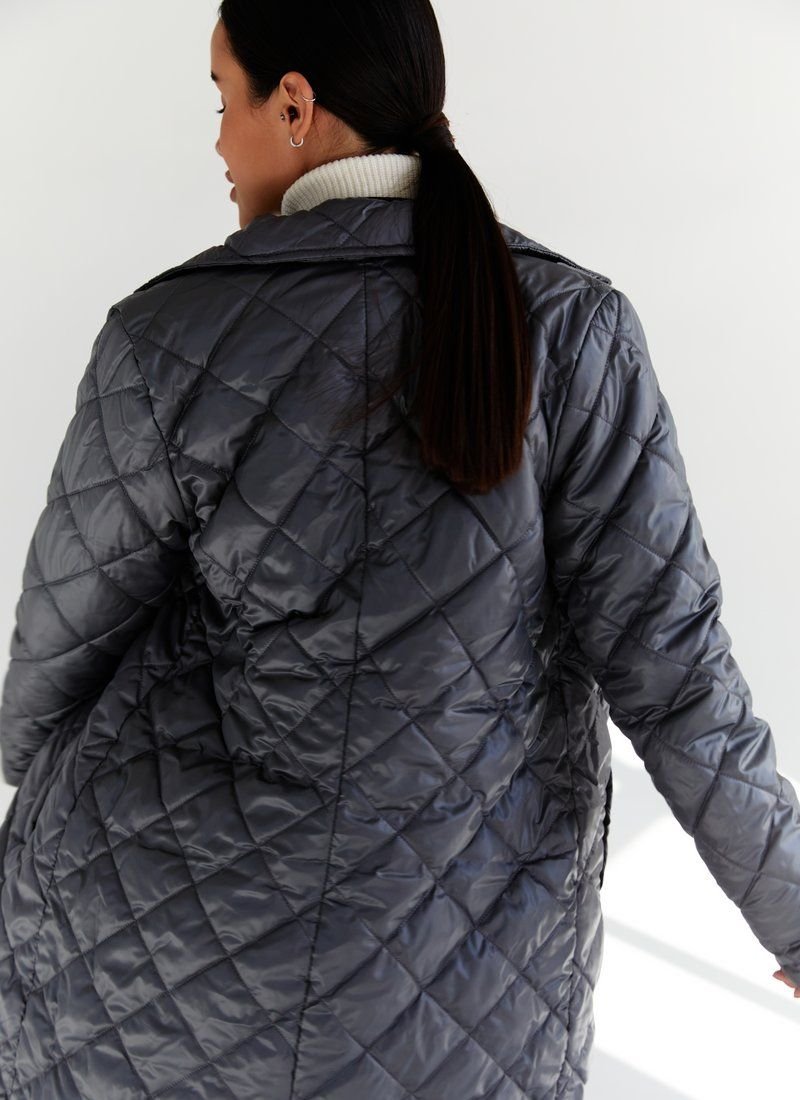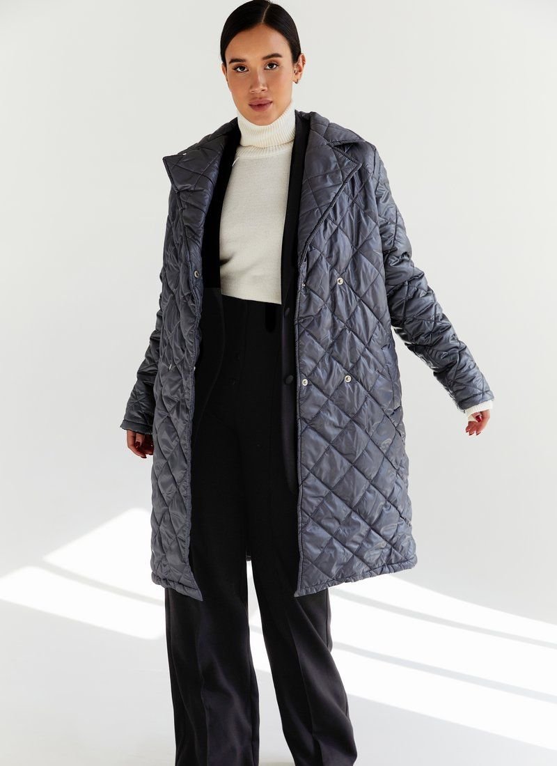Grey elongated jacket with buttons, straight cut, with lapels, complete with a matching belt. Quilted models have become a hit of the FW 2021/22 season. In their collections, this trend was supported by such fashion houses as Max Mara, Barbara Bui and Raf Simons. Features: the role of insulation is sintepon (80 g/m2). Please note that the product is designed for temperatures up to +10 ° C.