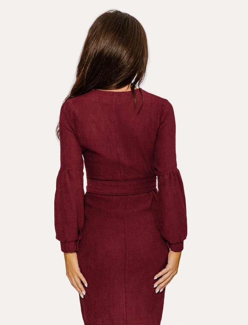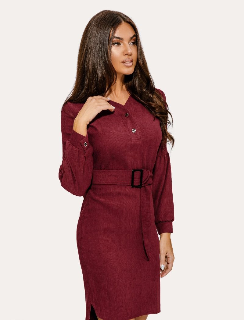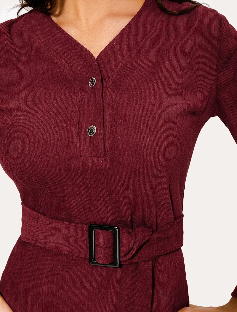 Corduroy burgundy mini dress: v-neck with buttons, a long voluminous sleeve on the cuff with a detachable button, a skirt with a rounded hem, complemented by a plain belt.