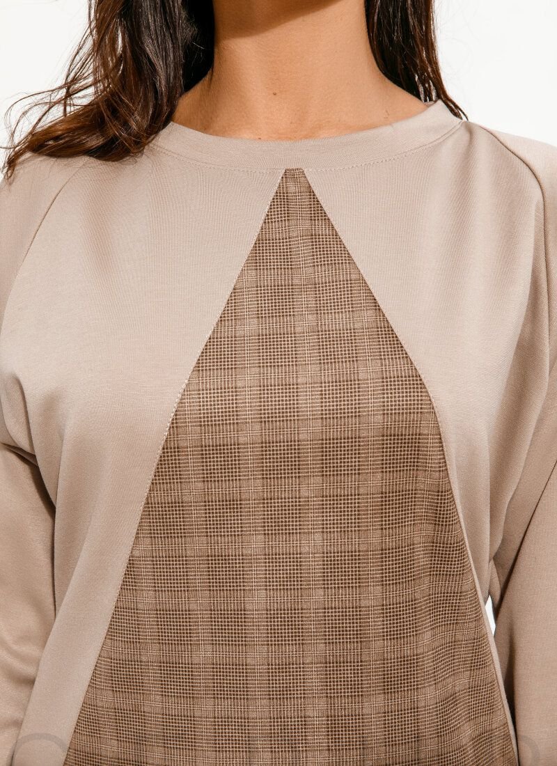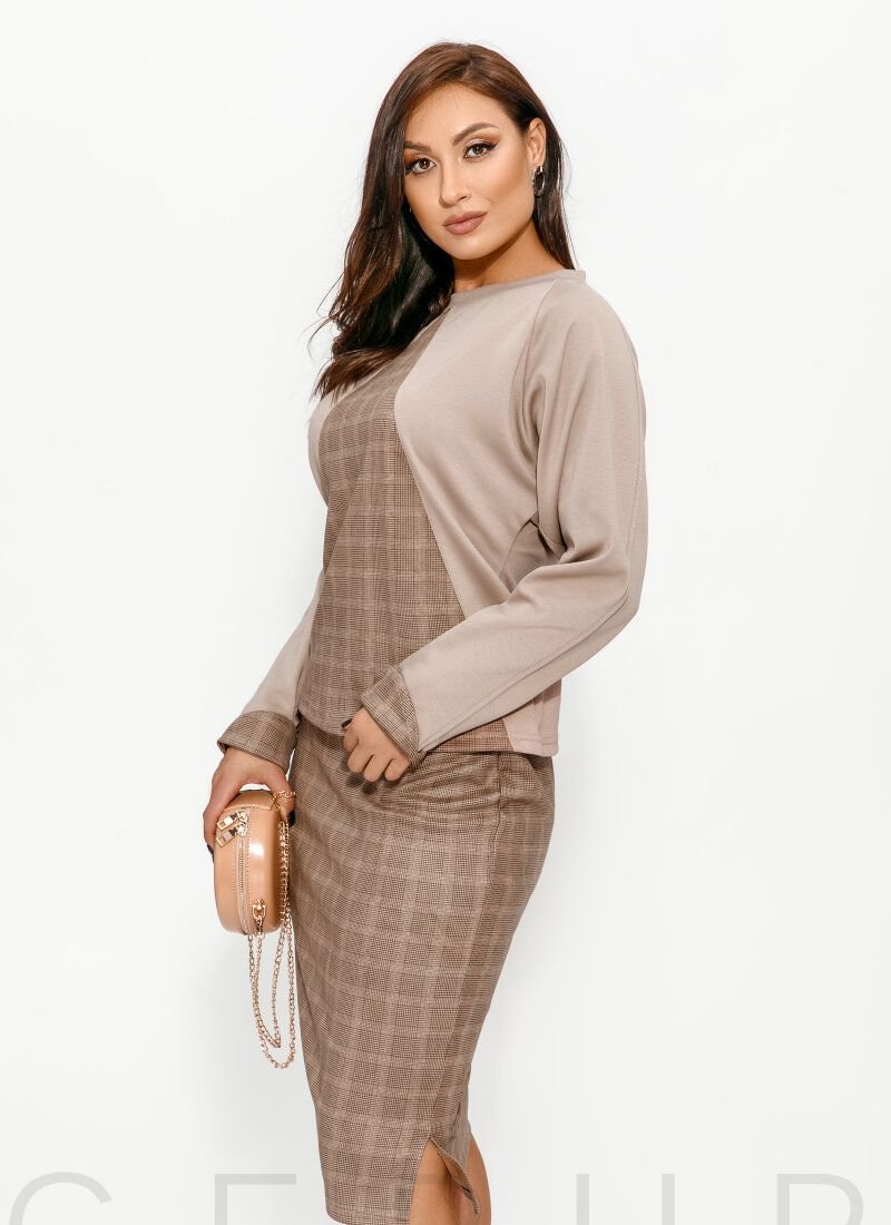 Stylish casual beige suit: a jumper with a round neck, a raglan sleeve with a turn-down cuff, a contrasting modeling insert in the front, a straight-cut skirt with an elastic insert at the waist and low side slits.
