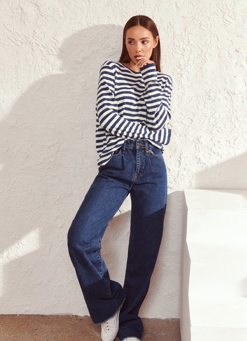 Striped jumpers - vests, remain relevant regardless of fashion trends. The blue shade model is made of soft knitwear. In SS'21, it can be combined with trendy wide jeans, leather or palazzo trousers. Accessories - bright bags, large earrings and chains will also help to add the spirit of modernity to the image.