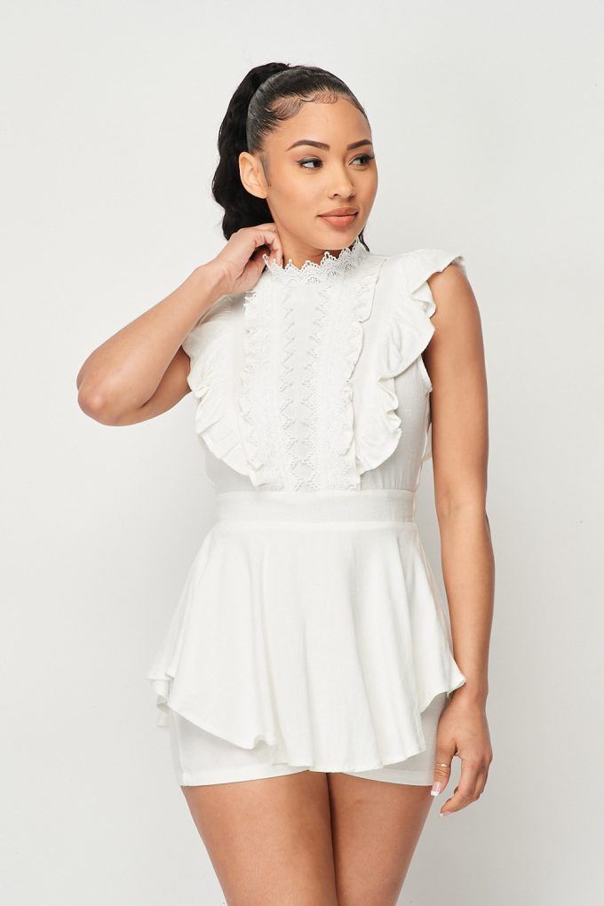 Imported S.M.LFLIRTY LACE FRONT HI-LOW ROMPER WITH WAIST TIE70% Cotton 30% Linen Ivory PRI