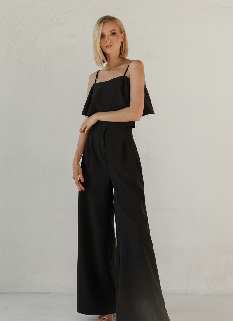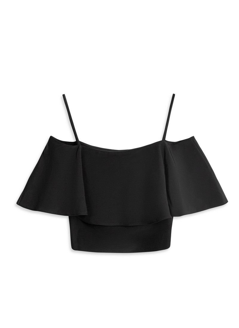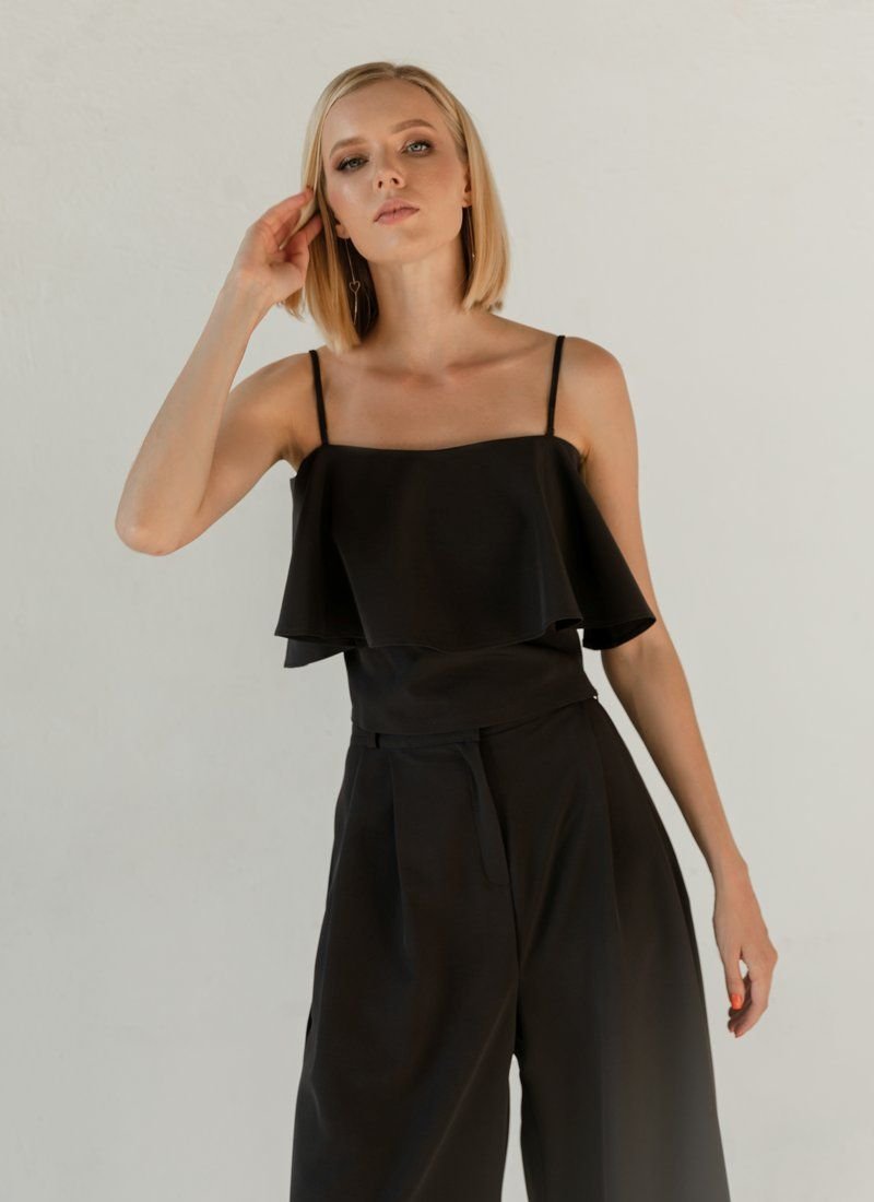 A short black top with thin straps, with a wide flounce along the chest line, covering the sleeves. It will look great in any of your looks, and also in combination with trousers forms a suit.