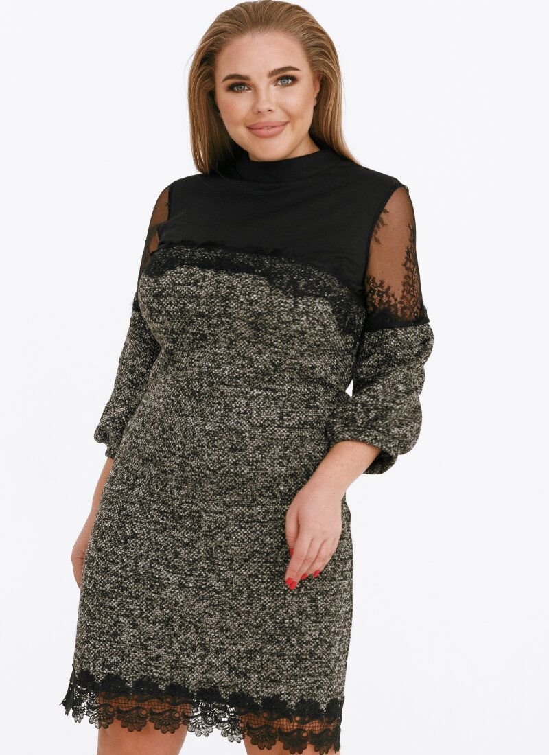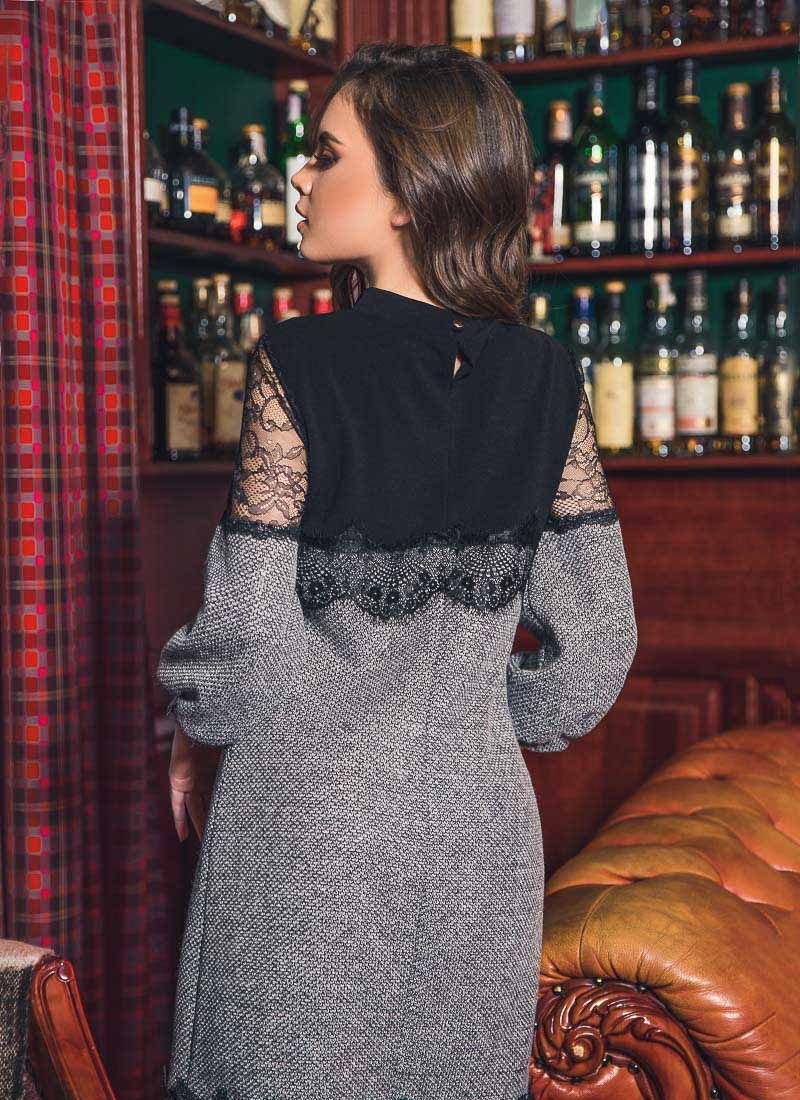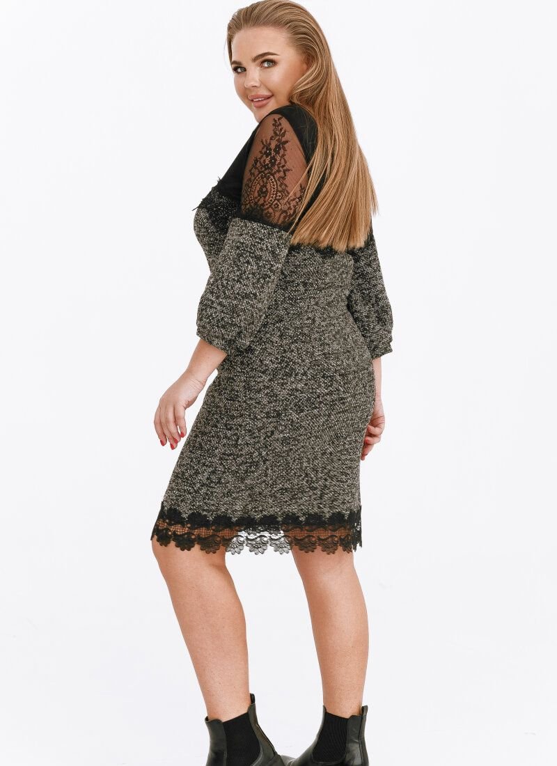 Elegant mini dress with a neat stand-up collar, 7/8-length sleeve with lace inserts, complemented by a removable brooch.